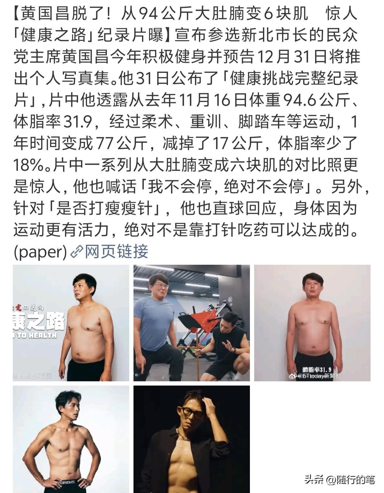 民众党黄国昌为了竞选新北市长真的绞尽脑汁了,连自己的健身减肥过程都要制作成纪录片发表,并且还把每个阶段身材的照片写真发出来对比,还详细介绍自己的减肥方法,对减肥的看法,搞得自己像个明星艺人一样。 看黄国昌的身材减肥前后的对比,他是减肥成功的,看得出他也很自豪能够减肥成功,但这样公布出来大肆宣传就肯定另有所图了。表面上看是在呼吁大家健康减肥,但是实际上是在宣传他自己,想提高他自己的声量,企图借减肥来拉近与新北选民的距离,博取选民对他个人的认可,支持他竞选新北市长。不得不说,为了竞选,岛内这些政客真的是无所不用其极,不放过每个可以宣传自己的机会。