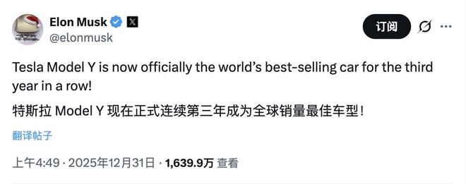 特斯拉CEO埃隆·马斯克昨天在X发文表示,特斯拉ModelY车型已连续第三年(2023-2025)蝉联全球最畅销汽车桂冠。