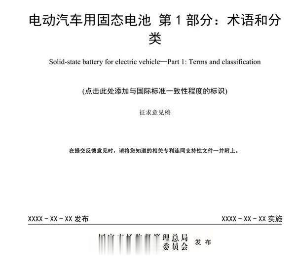 日前,全国汽车标准化技术委员会就《电动汽车用固态电池第1部分:术语和分类》公开征求意见,这标志着中国首个固态电池国家标准正式出炉。