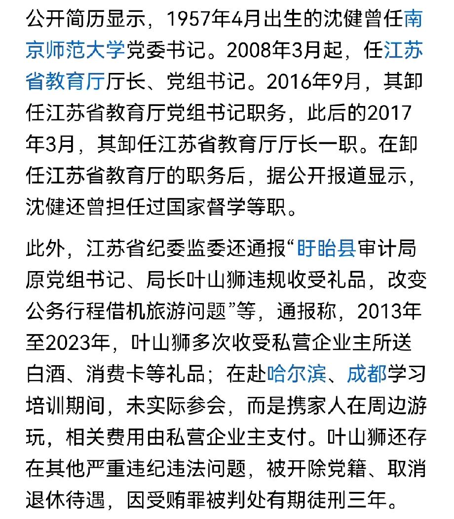 这位老干部叫沈健,原江苏省教育厅的厅长,在新年来临的前一天出事了,因为是退休老同志,只是被取消了退休待遇,损失巨大。 提起沈健,江苏的很多家长就搂不住火。他任职厅长是08-16年,把江苏中考高考搞得浪花四溅,有人说他主持下年年改革,次次失败不知所云手足无措,没少坑学生。尤其是“点招”几乎就是公开操作,哪个大学多少分,明码标价童叟无欺。 说句实话,把江苏高考的锅都扣在沈厅头上有点过了,折腾其实在他之前就开始了。但是南京的家长怪罪他倒是有情可原,那些年的素质教育和禁止令在他的眼皮底下盯得很紧,直接导致南京的高考录取一蹶不振。家长围教育部门的场景,犹在眼前。 没进去就好,可惜了那么高的退休金和更令人眼热的……“待遇”。