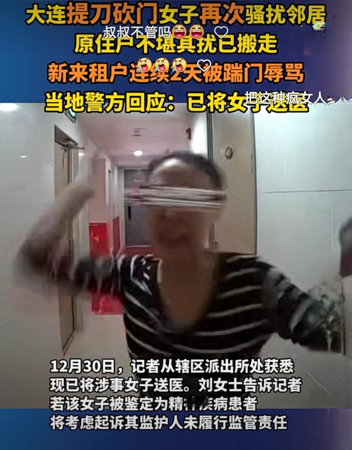 终于被帽子叔叔送进去了 2025年12月31日,大连持续骚扰邻居的持刀砍门女子终被警方送医。该女子自2024年10月起,因怀疑楼上邻居实施“脑控”,多次持菜刀砍砸刘女士家大门,踹门辱骂,甚至在业主群造谣,并在门口倾倒垃圾。刘女士全家因此陷入恐惧,孩子不敢上学、老人不敢出门,房屋也因事件影响难以出售。此前,警方虽多次介入调解,但女子在短暂关押后变本加厉,甚至在2025年12月23日至24日连续两天上门骚扰新租户。最终,警方依据《精神卫生法》相关规定,将该女子送医进行精神鉴定与治疗。刘女士表示,若女子被鉴定为精神疾病患者,将考虑起诉其监护人未履行监管责任。此事件暴露出精神障碍患者管控、家属监护责任及警方处置程序等多重漏洞,引发社会对精神障碍患者管控机制的广泛关注。