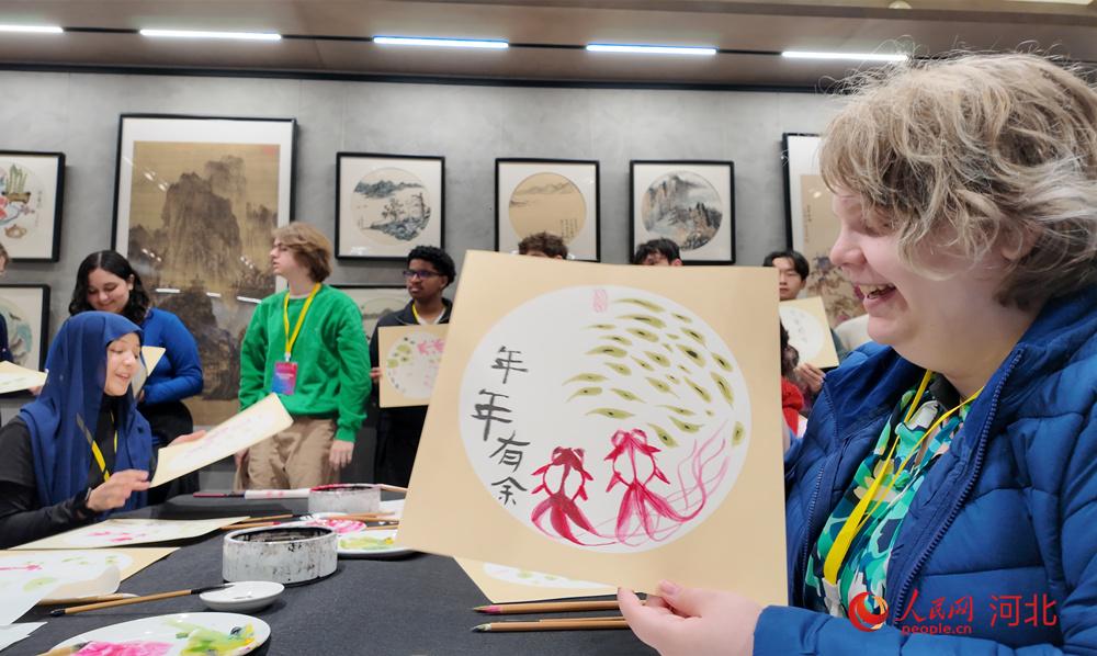 青少年“友谊传承”研学团成员展示学习和创作的作品。人民网记者林福盛摄