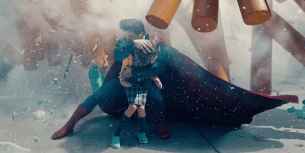 《蝙蝠侠大战超人:正义黎明》的开场,从本·阿弗莱克饰演的布鲁斯·韦恩视角展开,展现了超人撞进大楼、建筑倒塌的场面。蝙蝠侠冲入废墟,试图拯救受困的平民。