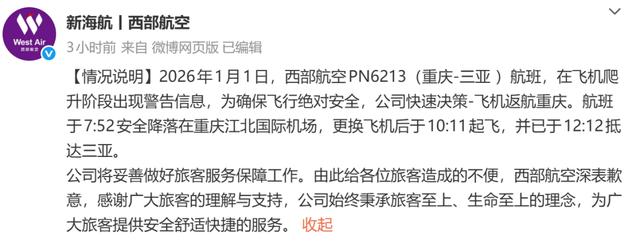 西部航空官方微博消息,2026年1月1日,西部航空PN6213(重庆-三亚)航班,在飞机爬升阶段出现警告信息,为确保飞行绝对安全,公司快速决策-飞机返航重庆。航班于7:52安全降落在重庆江北国际机场,更换飞机后于10:11起飞,并已于12:12抵达三亚。