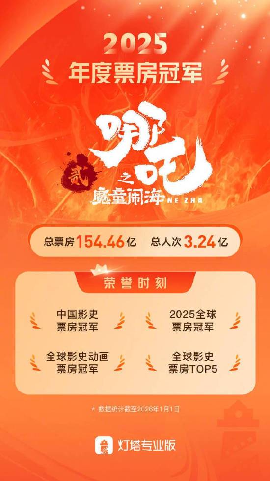 直播吧1月1日讯 据灯塔专业版,《哪吒之魔童闹海》以154.46亿票房成为2025中国内地市场年度票房冠军,同时也是2025年度全球票房冠军!