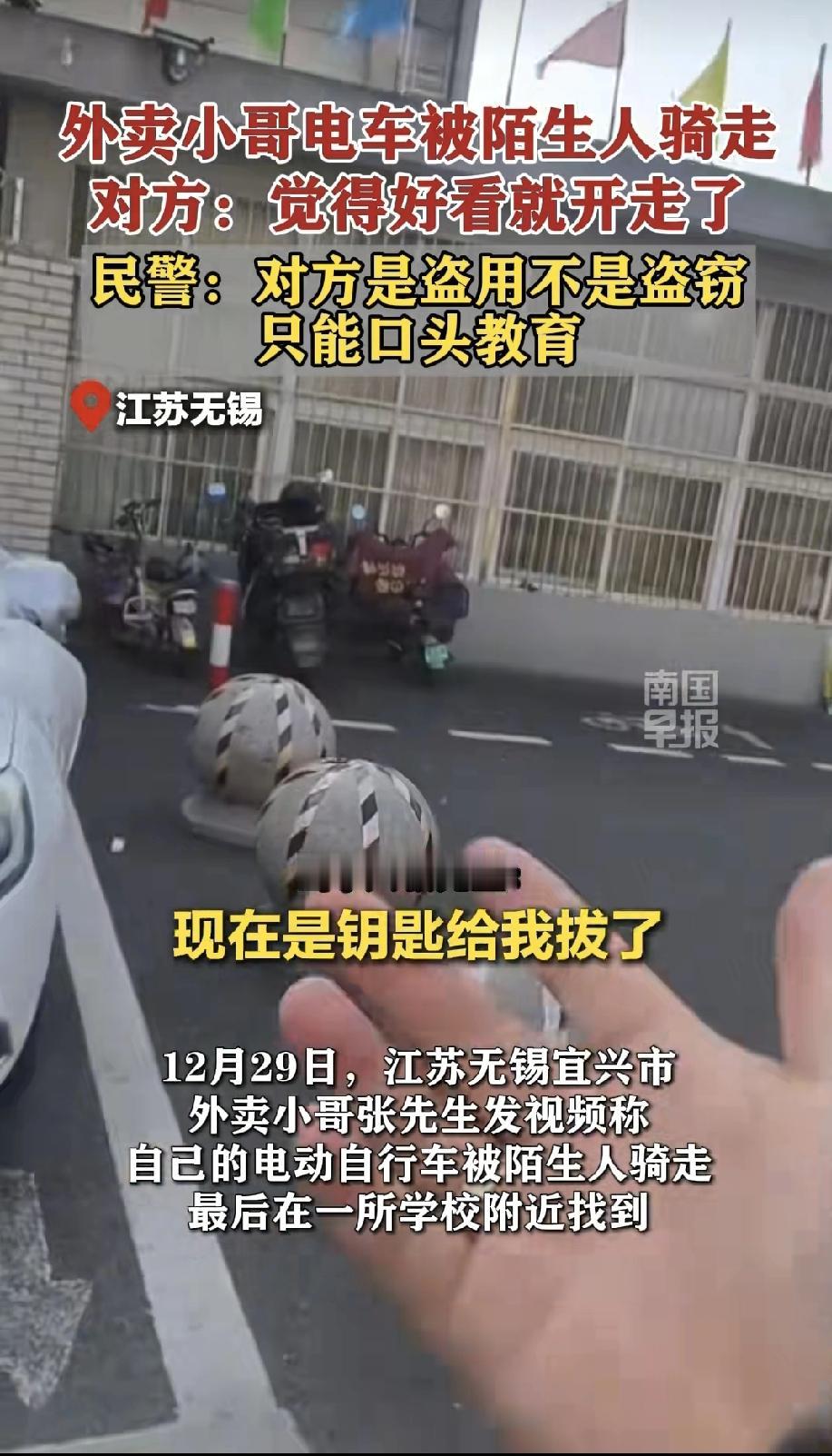 看到后懵了!不理解,偷了不卖就不算偷,算盗用,只能口头教育。 江苏无锡的一位外卖小哥送餐期间电动车被陌生人骑走,不但耽误跑单,还扣钱。 民警找到车子和偷车贼后,车子被放在其他公共区域,钥匙也被偷车者拿走,面对民警询问,偷车贼称是看到车子好看就骑走了。 原本以为民警会对偷车者进行处罚,没想到却说未进行车辆买卖或私下交易,是盗用并非盗窃,只能口头教育。外卖小哥要求赔偿误工费也被拒绝。 第一次听说偷东西只要不卖就不算偷,如果只是口头教育,那这个人是不是就会觉得是合法的,越来越嚣张,还会这么干或者更猖狂? 若按照这个逻辑,多少盗窃案都能借着盗用的名义蒙混过关? 实在让人难以认同这样的结果。 当然,具体细节和案情定性还是以官方为准。 对于此件事,你怎么看? 电瓶车偷车 电瓶车偷窃 电瓶车盗窃