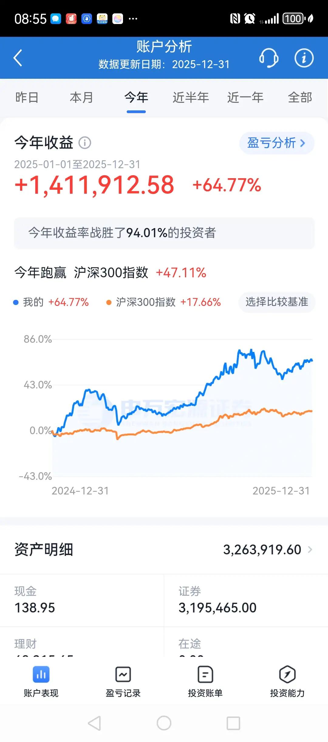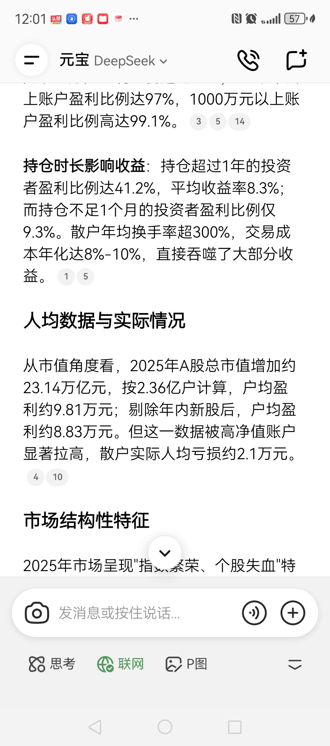 有问题问Deepseek!2025年股民的盈亏情况,和我研判的差不多。一方面越有钱的人越容易赚钱,另外一方面,大部分的普通散户还是亏损的,散户人均亏损2万块钱左右。 第三第四第五张图是我2025年的收益,还是不错的!