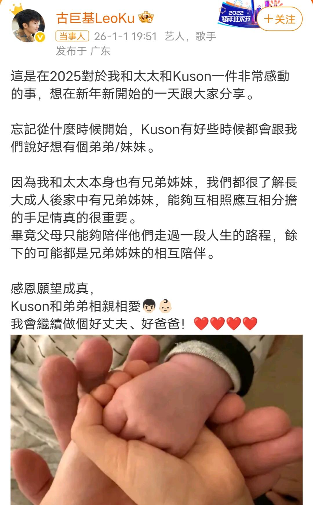1月1日,新年第一天,古巨基就向我们官宣了一个好消息,大儿子Kuson有弟弟了,他又当爸爸了,并称自己未来会继续当个好丈夫,好爸爸。 古巨基还晒出了一家人小手握在一起的照片,爸爸握着妈妈的手,妈妈握着Kuson的手,哥哥Kuson握着弟弟的小手,一家人都会保护和照顾好弟弟的。 对于为什么会生二胎,古巨基也给出了解释,因为大儿子一直都想要个弟弟或者妹妹,他和老婆考虑了很久,才决定给Kuson生个弟弟或者妹妹。 古巨基老婆陈韵晴今年都58岁了,已经是高龄产妇了,这次生下小儿子对她来说真的是个不小的挑战,还好最后母子平安。 古巨基和陈韵晴真的好爱孩子,就因为大儿子想有个弟弟或者妹妹有个伴,他们就勇敢的挑战二胎,做他们的小孩好幸福啊!