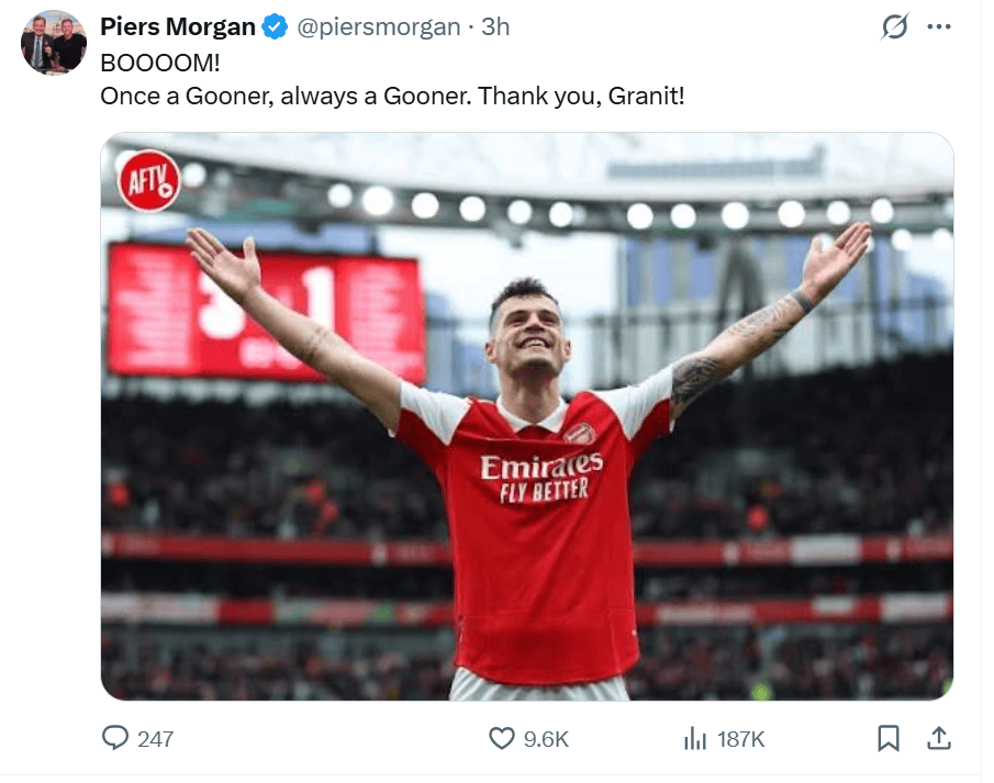 著名阿森纳球迷、知名主持人皮尔斯-摩根更新了社交媒体,发文感谢了前阿森纳球员、现桑德兰球员扎卡率队“阻击”争冠对手曼城。摩根在社媒上这样写道:炸裂!一日枪手,终身枪手。感谢你,扎卡!