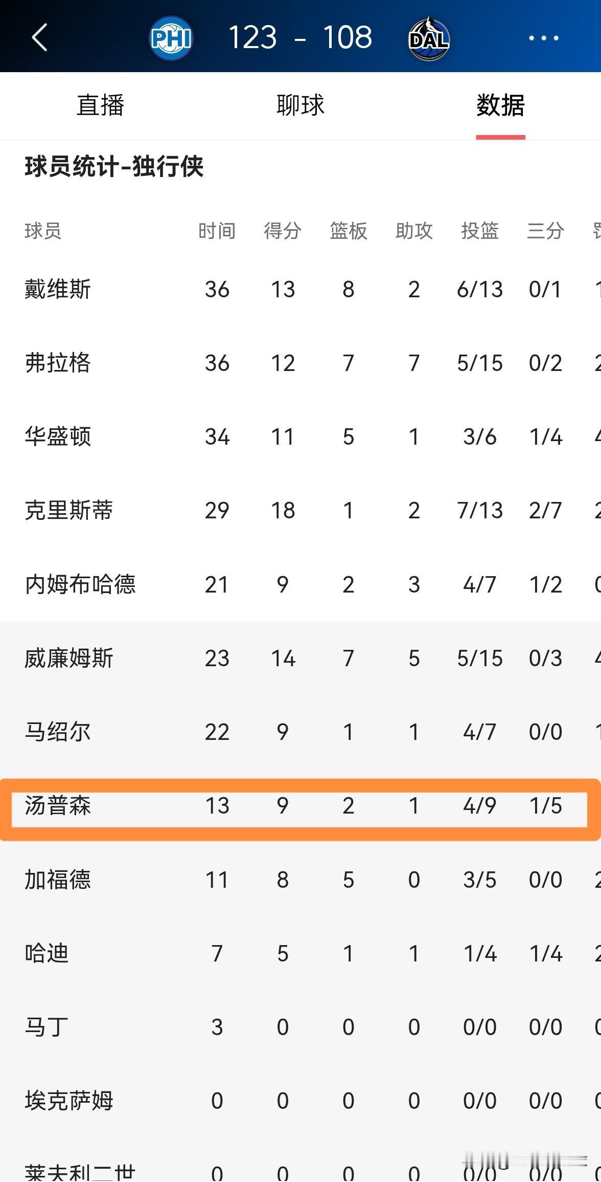谁能拯救一下独行侠神射手汤普森的三分球?在今天独行侠主场以108:123输给76人的比赛中,NBA历史上最伟大的三分射手之一的汤普森竟然投不进三分球了。全场比赛下来,汤普森替补出战13分钟,投篮9中4,其中三分球5中1得到9分,他的场上正负值为-12。 坦白说,如果汤普森在比赛中无法命中三分球的时候,他在场上的作用就会大大的减弱。
