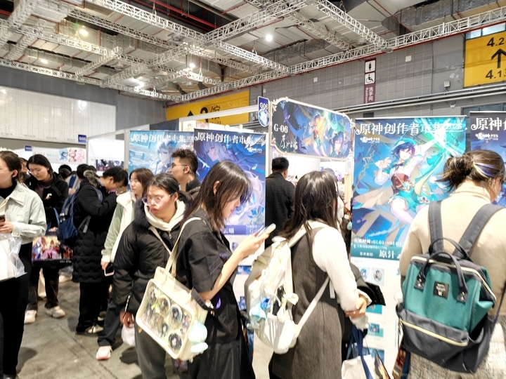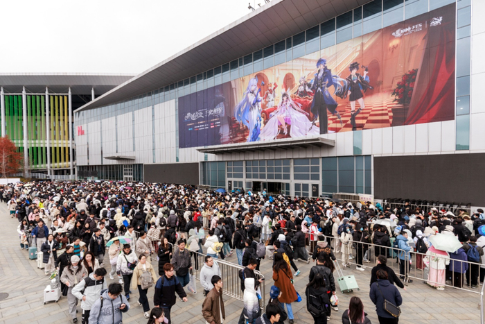 8万张票开售半分钟抢空;上海国家会展中心周边包括高档酒店在内的住宿爆满;会场处处排起长龙,等待与角色“死之执政·若娜瓦”合影的清一色男性玩家排了七八十位;等待购买新角色“菲林斯”周边的玩家需要排队半小时;开展首日下午三点多,已有同人摊位提前售罄。