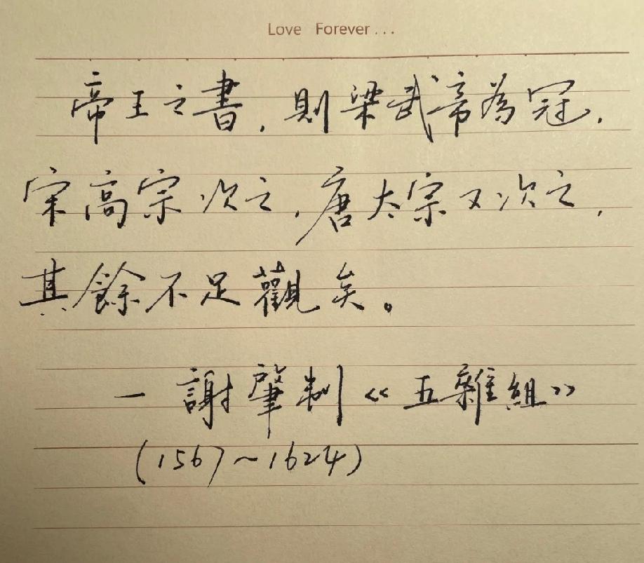 疑似《西游记》的作者谢肇淛在他的读书随笔札记中对中国历史上帝王的书法做了一个排名,他认为梁武帝排名第一,宋高宗第二、唐太宗第三。 那叫历史上艺术成就最高、号称“书画双绝”的宋徽宗情何以堪?“十全老人”的乾隆皇帝肯定也是不服的!下面图2、3是宋徽宗的书法作品,图4是乾隆皇帝的书法作品。 大家觉得上面的排名怎么样?