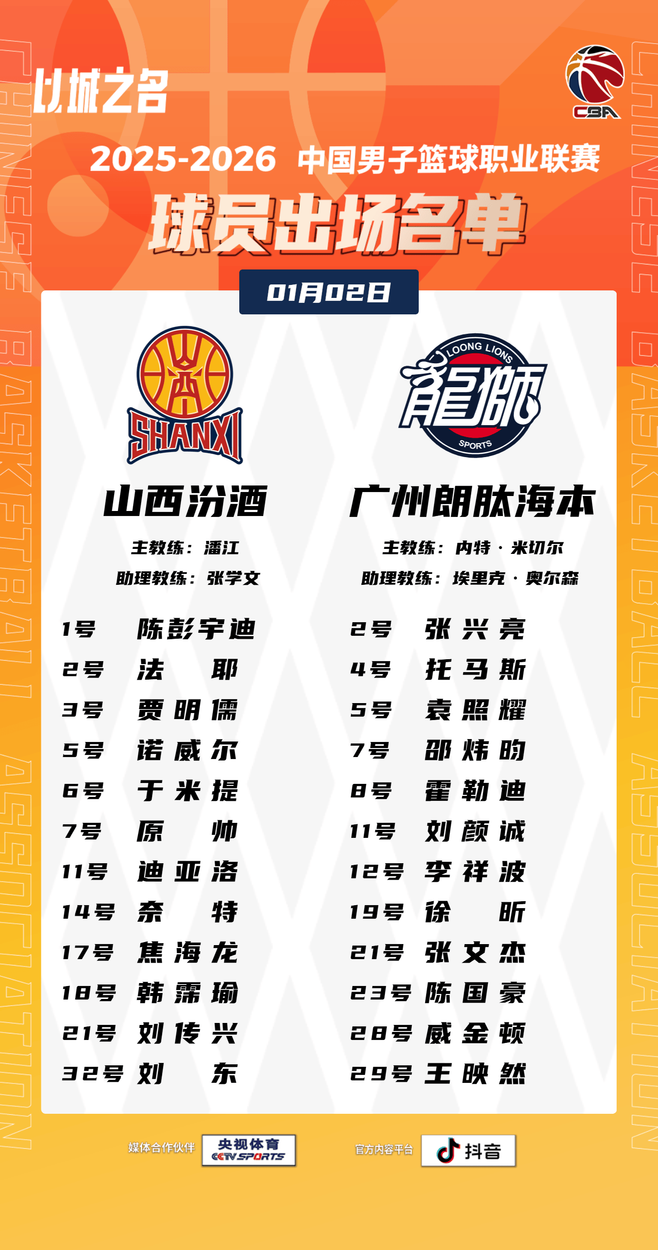 虎扑01月02日讯今晚CBA常规赛,山西对阵广州的大名单已经公布。