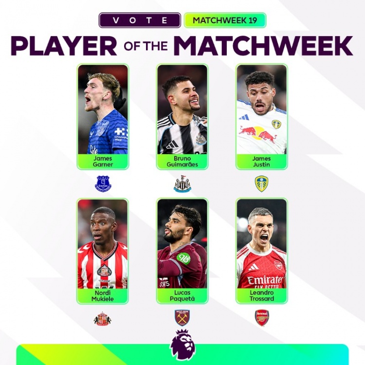 直播吧1月2日讯英超官方公布第19轮最佳球员候选,詹姆斯·加纳、布鲁诺·吉马良斯、詹姆斯·贾斯汀、穆基勒、帕奎塔、特罗萨德6名球员入围。