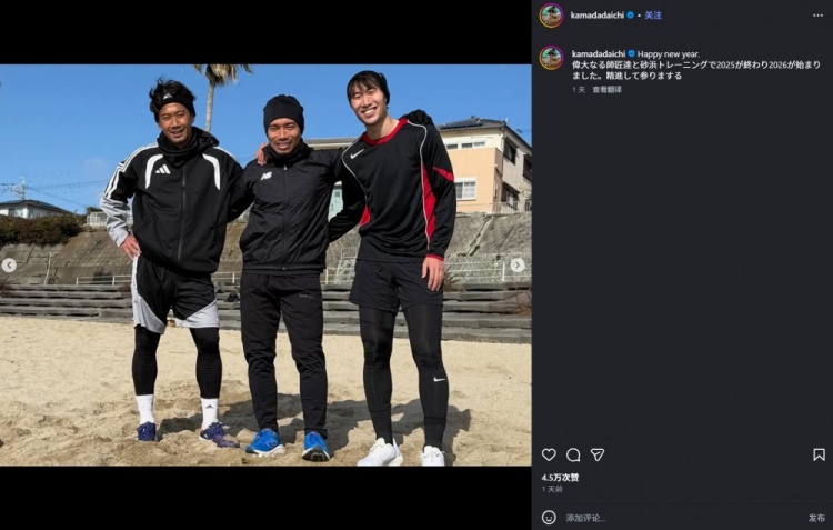 镰田大地在社媒中写道:“新年快乐,2025年以与大师们一起进行海滩训练而告终。2026年已经开始,我会继续努力。”