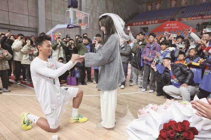 昨天晚上,“浙BA”城市争霸赛嘉兴经开区队与湖州队比赛结束后,经开区队4号球员黄玉强在队友和球迷的见证下,向相恋多年的女友求婚。原本挥洒汗水的竞技赛场,摇身变为满溢幸福的求婚现场。这突如其来的惊喜,不仅让现场观众感受到体育竞技之外的温情,更成为这个夜晚“浙BA”赛场最动人的注脚。