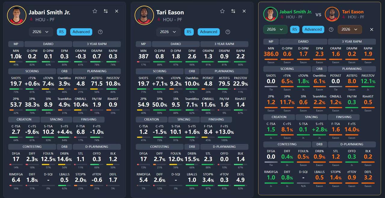 发了关于伊森和小贾巴里-史密斯能力谁强谁弱的讨论。发现火箭球迷真的很有意思,一边非要说史密斯比伊森更强,另一比根本说不出强在哪。 谁不知道伊森出勤率不行,伤病多了点。但是个人能力,攻防两端的表现和对于比赛的影响力都是碾压史密斯的水平。那些说史密斯比伊森强的,清一色一句话,史密斯不受伤就是比伊森牛逼,回头加一句你不懂球。 各位要不看不看这两张图片然后告诉我,谁是意识流,谁不懂球,谁不看球,谁看了球白看了,以及最关键的一点到底史密斯比伊森强在哪?你觉得史密斯更强,那可以,告诉我为什么伊森的高阶数据几乎是碾压式领先史密斯,甚至在全队都是最好的水平? 另外我觉得史密斯的合同虽然金额略微高了点,但也不至于算是垃圾合同。火箭的问题是,你先和水平更低的球员续约了,把水平更高的球员放在那,而不是趁着他出勤率不高的机会赶紧续了他,非要等到他身价打出来了再去看怎么办,相当于就是每年直接亏500-1000万。