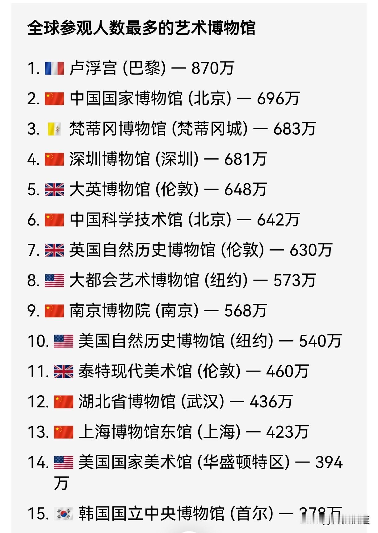 全球参观人数最多的博物馆(艺术馆) 前十五名排名: 中国占比六个 湖北省博物馆世界排名第十二 全国排名第五 湖北省博物馆有这么强吗?