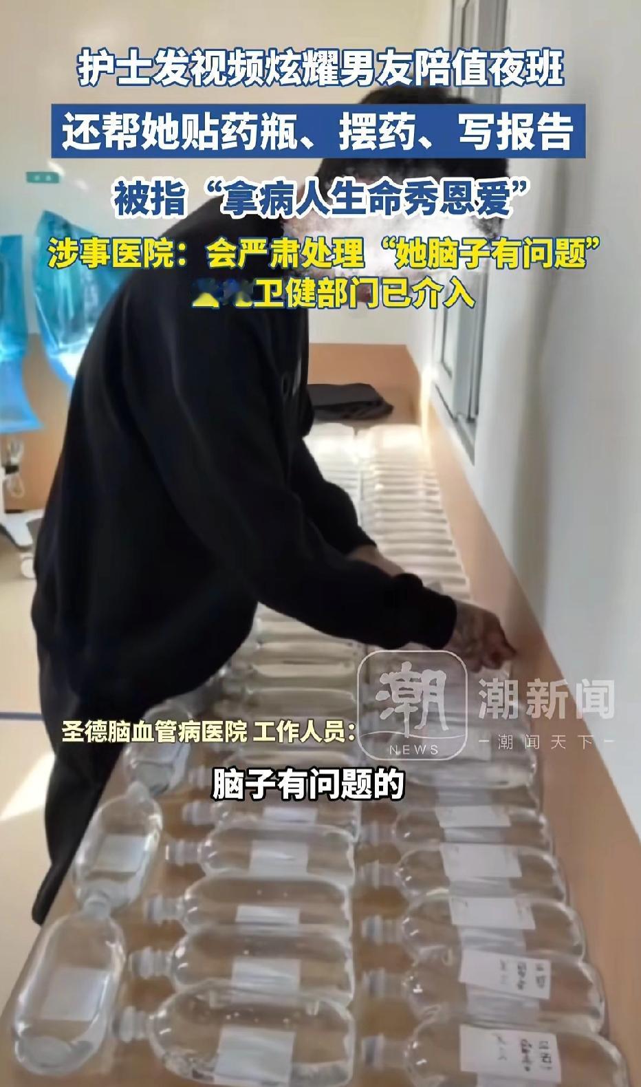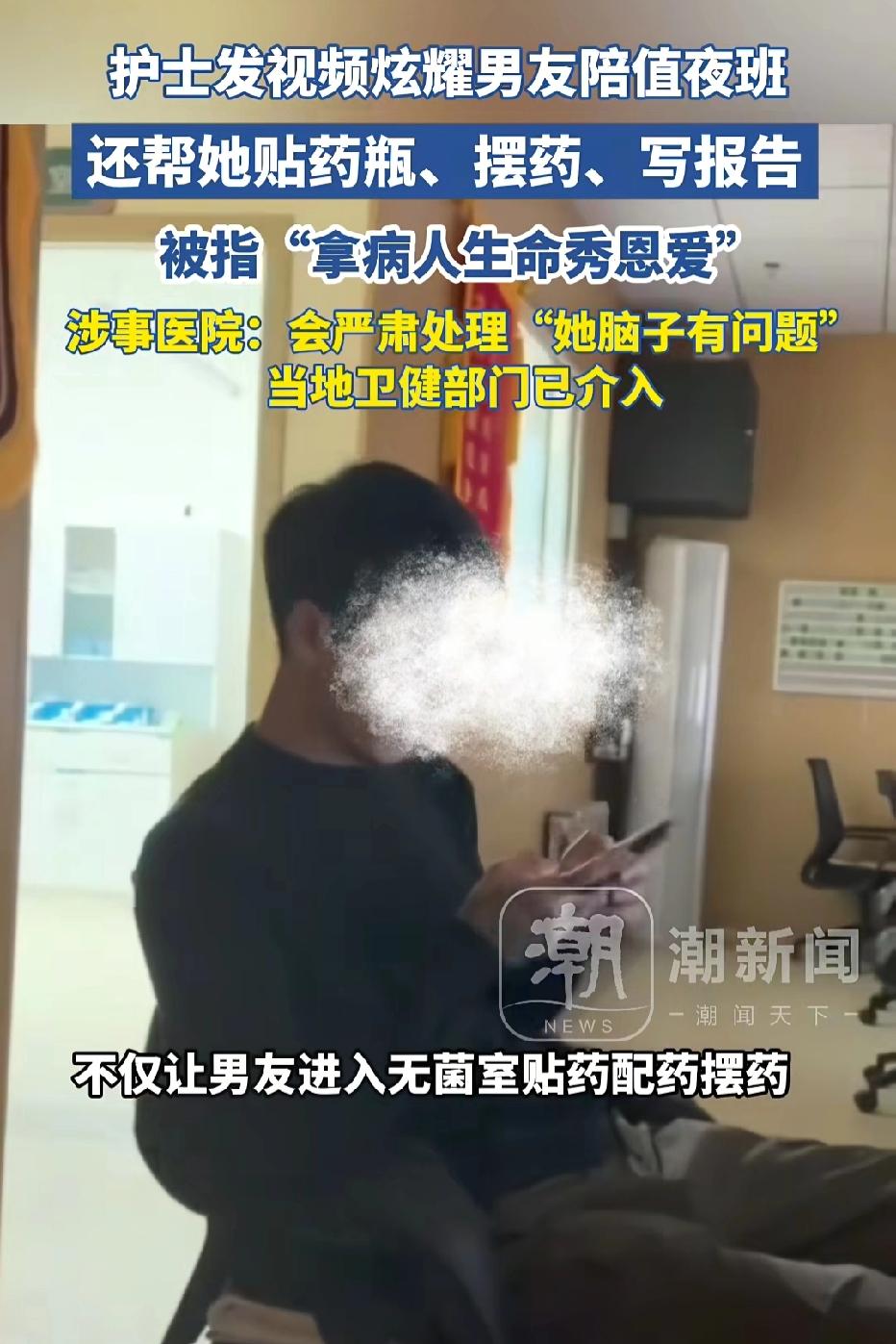 山东青岛,女护士值夜班,她男友过来陪她,女护士就分配任务给男友,指挥他贴药瓶,摆药,写报告。女护士甚至还将视频发出来炫耀,结局大快人心。 一女护士炫耀男友帮自己值夜班的视频,在社交平台上炸开了锅。 视频里那个指挥男友干活的女护士,怎么也想不到,自己甜蜜的炫耀,职业生涯瞬间跌入谷底。 据悉,一家医院的夜班值班室里,本该是严肃忙碌的工作场景,却成了秀恩爱的场地。 当天值夜班的女护士,嫌手头的活儿琐碎麻烦。 她干脆把前来陪她的男友当成了“免费劳动力”。 只见她把男友叫进无菌配药室,她拿着手机,一边拍摄一边指挥男友: 把这些药瓶摆到上面来,这个药瓶标签贴这里,还有这些要那份护理报告记得写清楚数据。 要知道,无菌配药室属于洁净区,非授权人员进入会增加药品污染风险。 女护士擅自将男友带入并接触药品,违反了药品调配区域的安全管理规定,可她还是这么做。 镜头里,男友笨手笨脚地贴着药瓶标签,时不时还得抬头询问细节。 而女护士则满脸得意地记录着这一幕,仿佛在向全世界展示自己的幸福。 夜班本就是医院管理的薄弱环节,人员少、任务重,更需要护士打起十二分精神,而不是把工作当成情侣间的游戏。 贴药瓶、摆药品、写护理报告,这些本该由专业护士严格按照规范完成的工作,就这样被一个毫无医疗资质的外行随意操作。 这哪里是情侣间的甜蜜互动,分明是拿患者的生命健康当儿戏! 医疗工作从来容不得半点马虎。 每一个药瓶标签的粘贴都关系到患者的用药安全,每一份护理报告的书写都记录着患者的病情变化,这些操作有着严格的专业规范和流程要求。 非专业人员的随意代劳,极有可能引发用药错误、病情延误等严重后果。 女护士的炫耀,暴露的是职业敬畏心的缺失,是对《护士条例》《医疗纠纷预防和处理条例》等法规的公然漠视。 更让人难以接受的是,这名女护士非但没意识到自己的错误,反而将视频发到网上炫耀。 视频一经传播,立刻引发轩然大波。 网友们纷纷指责非工作人员能随意进配药室?医院也要加强巡逻查看。 好在涉事医院也严肃处理此事,女护士被停职处理。 《护士条例》规定护士必须严格执行规章制度和技术规范。护士经执业注册取得护士执业证书,才能从事护理活动 。 涉事女护士让未取得护士执业证书的男友从事贴药瓶标签、写护理报告等护理活动,违反了该条例。 《医疗机构管理条例》 第28条规定,医疗机构不得使用非卫生技术人员从事医疗卫生技术工作。 涉事女护士让男友帮忙贴药瓶、写报告等,其男友属于非卫生技术人员,该行为违反了此条例。 医疗无小事,每一次严谨的操作,都是对生命的最高致敬,任何逾越职业红线的行为,终将受到应有的惩罚。 对此,你怎么看?