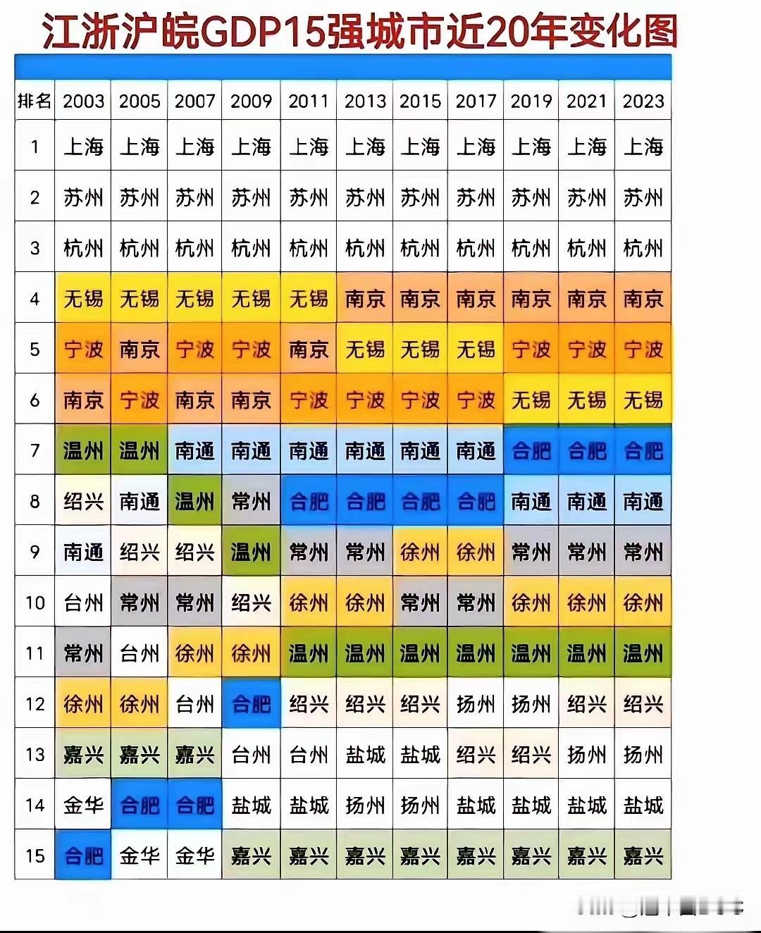 这张“江浙沪皖GDP15强城市20年变化图”,简直像一部区域经济沉浮史,细细品味,能挖出不少硬货。20年弹指一挥,有的城市稳坐钓鱼台,有的却像黑马般杀出重围,看得人感慨万千。 先说稳如泰山的“铁三角”——上海、苏州、杭州。从2003到2023年,榜首永远是上海,这龙头地位没人能撼动;苏州牢牢占着第二,经济韧性十足;杭州紧随其后稳居第三。这前三甲的格局,二十年如一日,成了长三角乃至全国的经济定盘星。但真正精彩的,是后面的你追我赶。 第一大黑马,非合肥莫属。2003年它还吊在车尾,排第15名,谁曾想一路狂飙,2023年直接冲到第7!这进步幅度,放在全国都罕见。从“长三角旁听生”到“正式生”,合肥靠科技和创新硬生生闯出一条路,量子、新能源这些名片越来越亮,这匹黑马,跑得是真猛。 第二匹黑马,得给徐州。别看它起点不高,2003年排第12,中间还跌宕起伏过,但始终在咬牙往上攀。尤其是近几年,稳在了第10名左右,2023年位列第12。作为淮海经济区核心,徐州转型扎实,从老工业基地转向高端制造,这“二马”的耐力,不可小觑。 第三匹黑马,则是宁波。它一直在一线阵营,但位次有过波动,比如曾和南京缠斗不休。20年里,它多数时间稳居前五,2023年排第5。宁波的厉害在于,既有港口经济的底子,又抓住了跨境贸易、数字经济的风口,韧性十足,堪称“耐力型黑马”。 这里就引出一个焦点——南京和宁波的“第四名”之争。南京曾长期稳坐第四,但宁波追得越来越紧,几乎是“无限接近”。从图上看,2013年后南京基本占着第4,宁波紧随其后,两者差距肉眼可见地缩小。南京高校云集、底蕴深厚,但宁波民营经济活跃、外向型优势明显,这场拉锯战,恐怕还得打下去。 总之,这张图背后,是城市命运的鲜活写照。铁三角的稳定,给了区域底气;黑马的奔腾,注入了新活力;而贴身竞争,更催生了整体进步。江浙沪皖的这盘经济大棋,下得真是越来越精彩了。