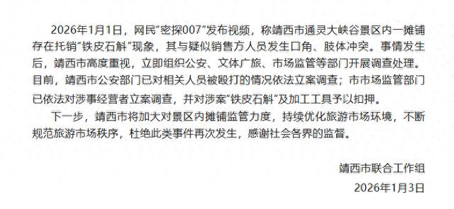 2026年1月1日,网民“密探007”发布视频,称靖西市通灵大峡谷景区内一摊铺存在托销“铁皮石斛”现象,其与疑似销售方人员发生口角、肢体冲突。事情发生后,靖西市高度重视,立即组织公安、文体广旅、市场监管等部门开展调查处理。目前,靖西市公安部门已对相关人员被殴打的情况依法立案调查;市市场监管部门已依法对涉事经营者立案调查,并对涉案“铁皮石斛”及加工工具予以扣押。
