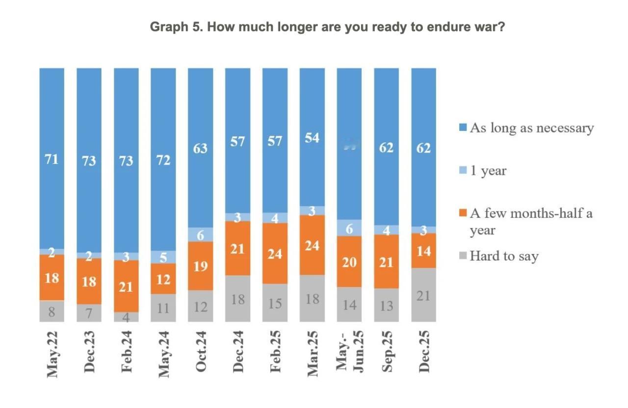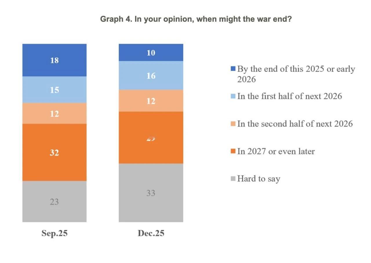 基辅国际社会学研究所(KIIS)于2025年11月26日至12月29日开展的一项调查显示,在被问及俄乌战争结束时间时,有29%的乌克兰民众预测俄乌战争将在2027年结束,而三分之一的受访者(33%)表示“不清楚”。 此外,仅10%的乌克兰民众预计冲突会在2026年初之前结束(较去年9月调查的18%有所下降),此外仅有16%的民众认为冲突最迟能在2026年上半年结束(去年9月该比例为15%)。我也认为,俄乌战争将在2026年下半年结束。 总体而言,仅约四分之一的乌克兰民众预计冲突会在相对近期内结束,另有12%的民众认为冲突可能在2026年下半年结束。 尽管如此,大多数乌克兰民众(62%)仍表示愿意为了胜利坚持到底,耗时多久都在所不惜。还有3%的民众表示愿意再坚持约一年时间。 14%的受访者希望冲突能在更短时间内结束,比如半年或数月(该比例较9月的21%有所下降),而无法或者不愿意回答该问题的受访者占比则从13%上升至21%。 参考说明:本次基辅国际社会学研究所的调查于2025年11月26日至12月29日进行,采用电话访谈形式,抽样样本为乌克兰政府控制区内所有地区的随机手机号码,共对1001名18岁及以上的受访者完成了访问。 乌克兰当局暂时未控制区域的居民(即乌东四州亲俄的俄族人)未被纳入抽样范围(不过部分受访者为来自被占地区的境内流离失所者)。2022年2月24日后离开乌克兰的民众也未参与本次调查。 在常规情况下,对于此类抽样调查(置信水平95%,设计效应值1.3),相关指标的统计误差范围如下:数值接近50%的指标,误差不超过4.1%;接近25%的指标,误差不超过3.5%;接近10%的指标,误差不超过2.5%;接近5%的指标,误差不超过1.8%。 在战时状态下,除上述明确标注的理论误差外,调查结果还可能存在一定程度的系统性偏差。基辅国际社会学研究所此前已阐明过战时状态下可能影响调查结果质量的各类因素。