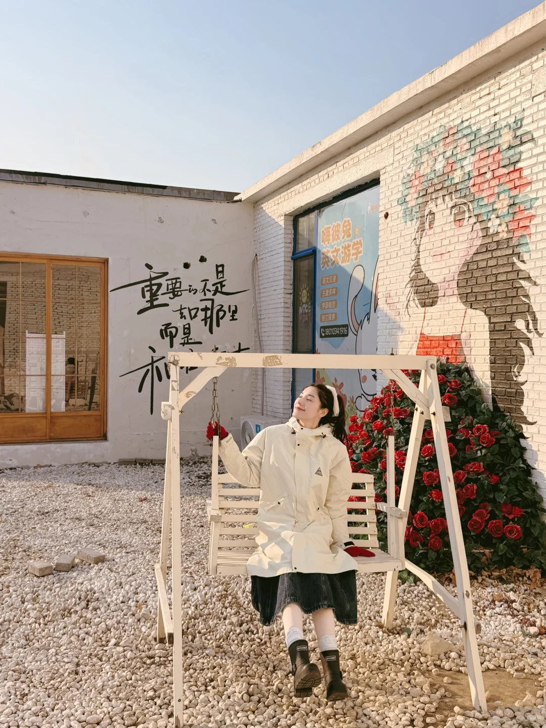 在白色房子一直向前走的路边,🏖️有一个大字墙和白色秋千,透过建筑的白色框架拍秋千也是个不错的视角🔖