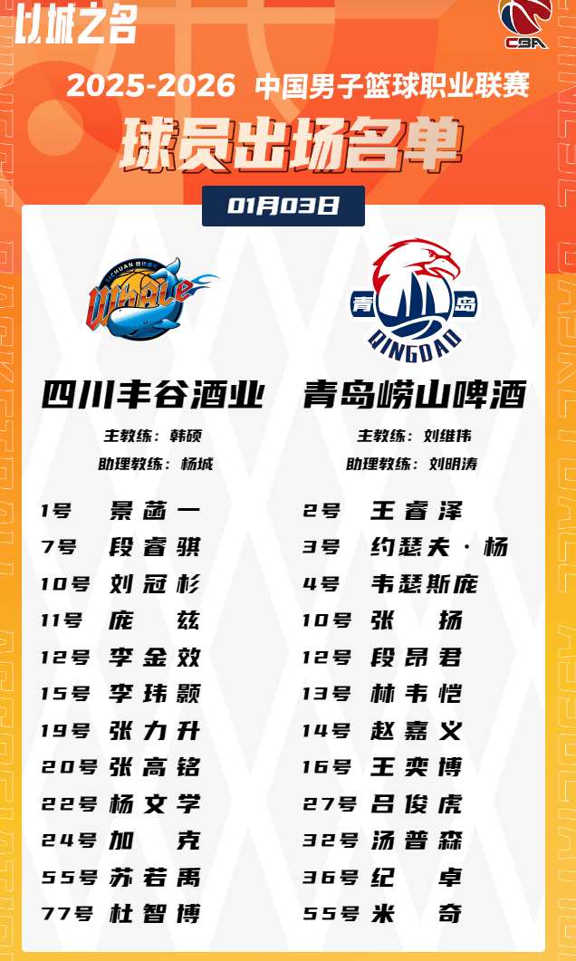 虎扑01月03日讯今晚CBA常规赛,青岛对阵四川的大名单已经公布。