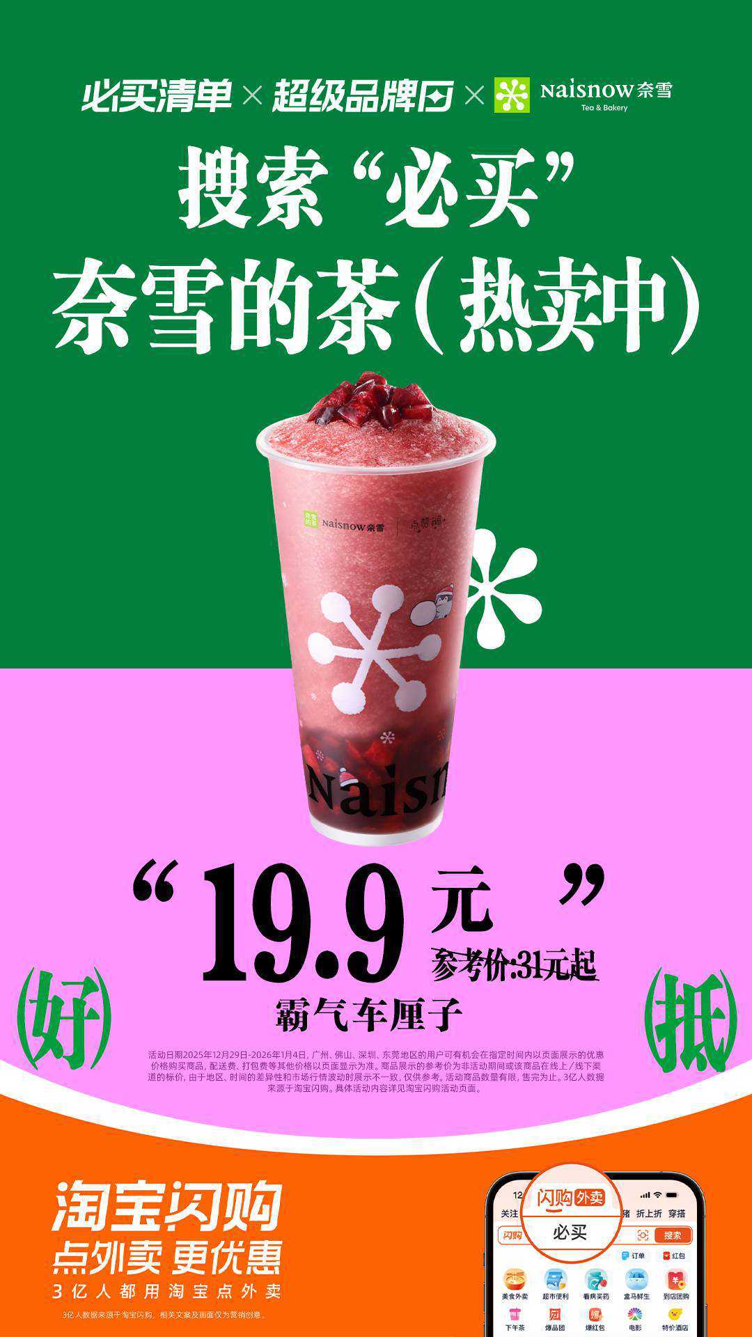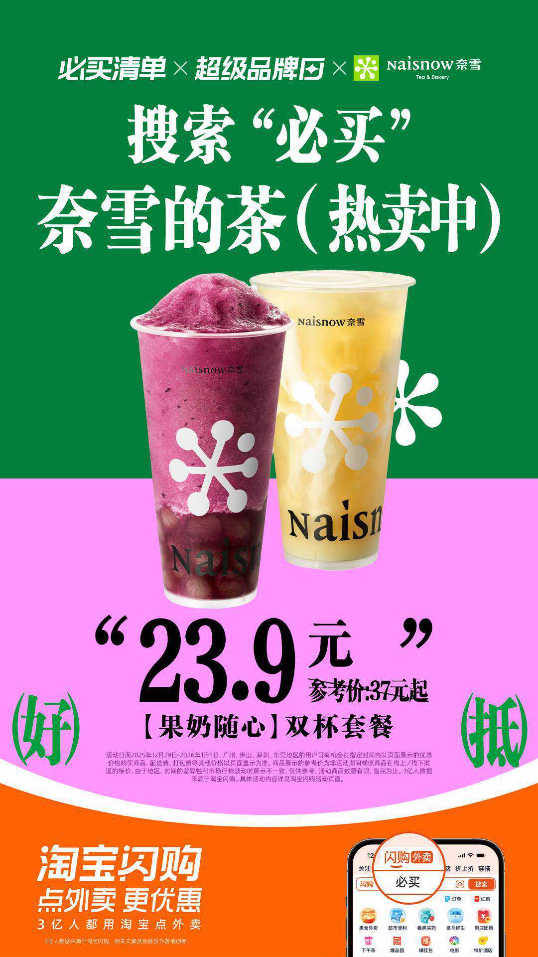新年晚餐想要清爽?来淘宝闪购!奈雪的茶果奶随心双杯套餐23.9元起,清爽果奶口感顺滑,搭配晚餐刚好;必买清单霸气车厘子19.9元起,鲜爽茶底+饱满果肉,一口超舒心。开年跟着淘宝闪购必买奈雪好运到不必费心搭配饮品,热门套餐直接选,无满减套路一口价,省下的心思享受美食。1月3-4日,上淘宝闪购搜【必买】,大牌靓价19.9元起,实付满25元可免费抽奖,百分百中奖!新一年嘅清爽晚餐带嚟新嘅舒适体验。开年跟着淘宝闪购必买奈雪好运到