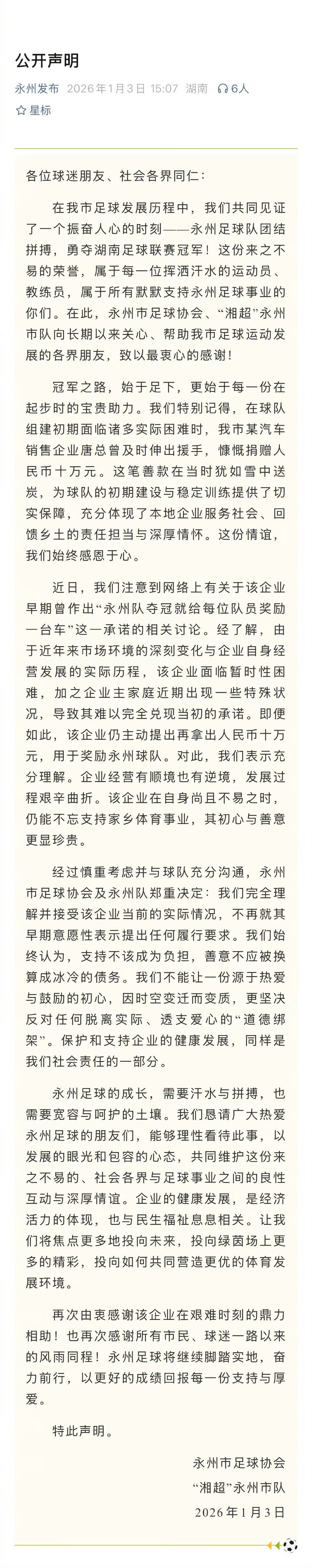 永州市足球协会声明 这声明既彰显了永州的大气,又体现了维护本地企业和形象的用心。当初唐蕾捐钱时,永州足球还没什么流量,能够一下拿出10万元钱,也是帮助球队解决燃眉之急。现在一些人说她在蹭流量,当初为何没人去蹭呢?还有一些网民说要抵制企业并让其关闭,纯粹是凑热闹借机散布不良情绪。