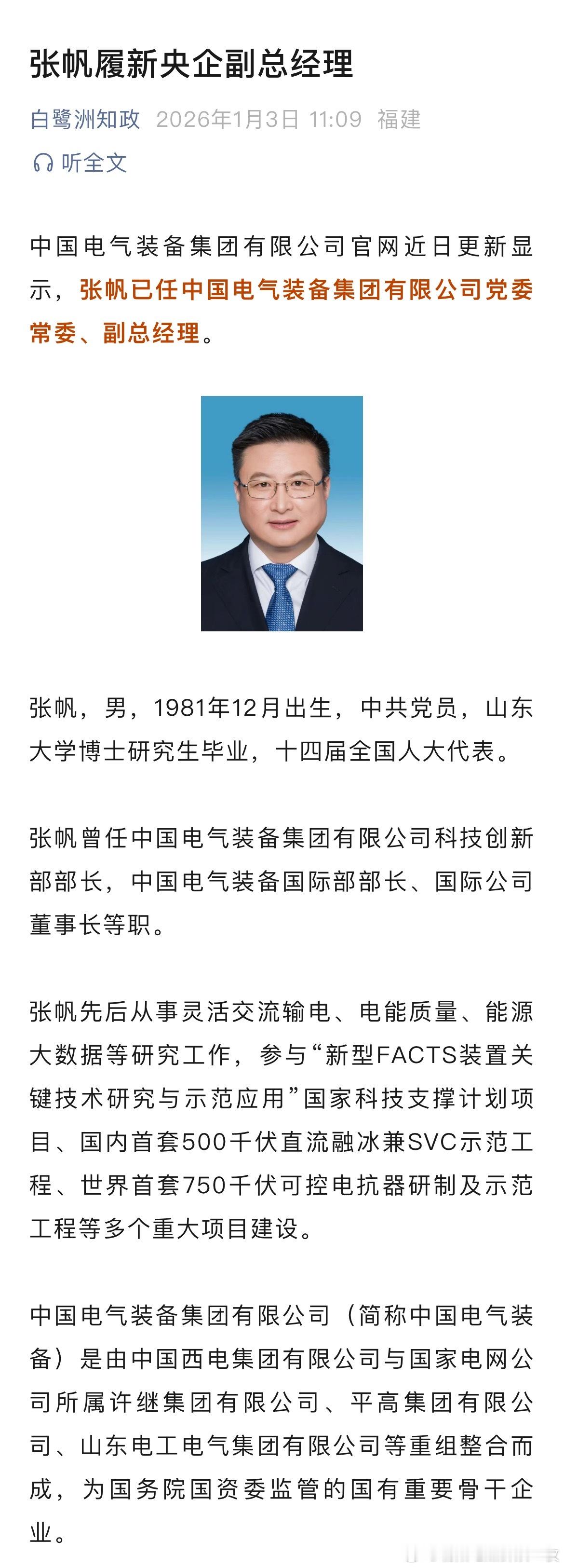 中国电气装备集团有限公司官网近日更新显示,张帆已任中国电气装备集团有限公司党委常