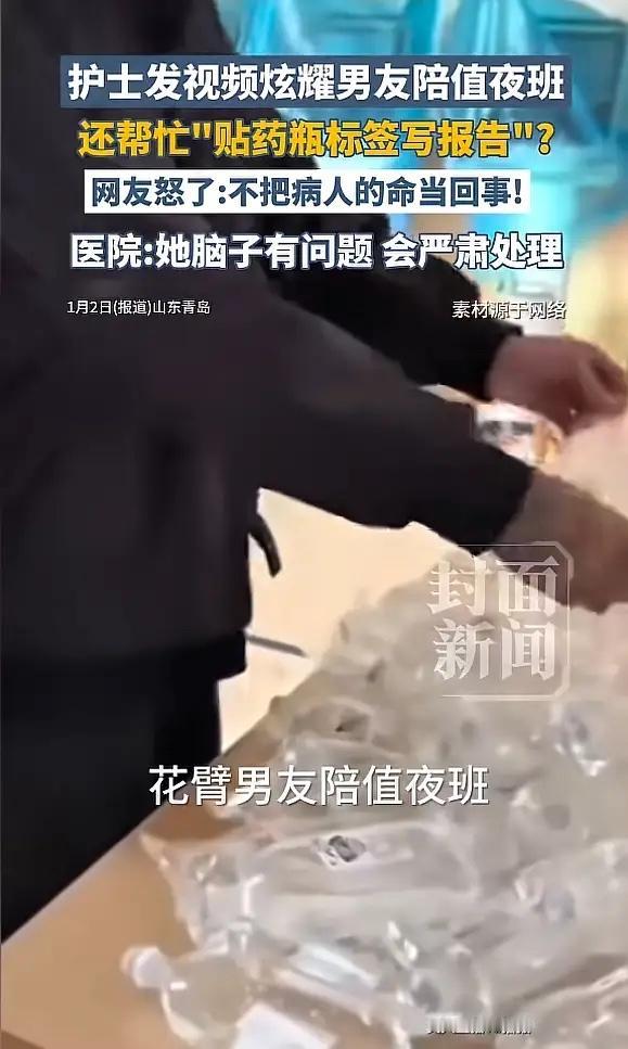 “必须严惩!”山东青岛,一护士值夜班时,擅自将男友带进病房区,不仅让男友代写医护记录,甚至还让他直接参与配药,护士则在一旁将整个过程用视频拍下,发到网上炫耀,本想秀一波恩爱,不料却引发众怒!医院:她脑子有病! 这段引发风波的视频最初由涉事护士本人发布在社交平台。画面里,一位穿着便服的男子,在护士站内来回走动。他不仅帮护士揉肩放松,还坐下来代写护理记录,进入配药区域动手贴起了输液瓶标签。护士给视频配的文字透着炫耀,称男友是她的“夜班搭子”,休班和下班都来医院“上班”,现任“听班”一职。 配药贴签关乎患者用药安全,必须严格执行“三查七对”制度,专业护士都需全神贯注,一个毫无医疗资质的外行人上手,风险极大。代写护理记录同样性质严重,这些文书具有法律效力,是诊疗和解决纠纷的重要依据,非专业人员书写极易出错,最终损害患者权益。 事件迅速发酵后,涉事护士清空了社交账号内容,试图平息风波。医院有工作人员在回应时称该护士“脑子有问题”,并表示会严肃处理。这番个人化的评价并未能平息公众质疑,为何一个无资质人员能如此轻易地长时间进出核心医疗区域?日常的巡查和监督机制是否存在盲区? 2026年1月3日,青岛市卫生健康委员会发布了正式通报。通报确认涉事护士在值班期间违反工作纪律,擅自将男友带入医院内二科病房区协助工作。医院已对该护士作出停职处理,市卫生健康综合监督执法部门也已介入调查,后续将依法依规对涉事医院和人员作出严肃处理。通报强调,医疗安全是保障患者生命健康的底线,将坚决查处一切违规违纪行为。 医院是守护生命的地方,任何环节的疏忽都可能造成无法挽回的后果。信任的建立需要长久努力,而它的崩塌可能只在一瞬间。每一次对规则的漠视,都是在透支患者对医疗系统的信任。 各位读者你们怎么看?欢迎在评论区讨论。