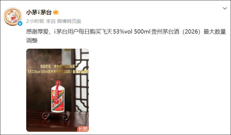 @小茅i茅台发布公告,为满足更多用户的需求,自1月4日至春节前,小茅将每人每日可购买的飞天53%vol500ml贵州茅台酒(2026)最大数量调整为6瓶。此前,每人每日最大可购买量为12瓶。