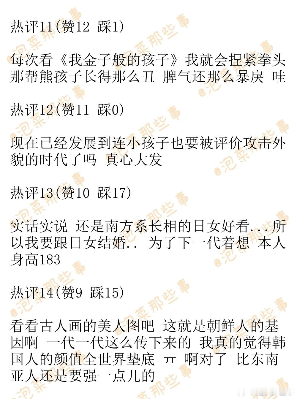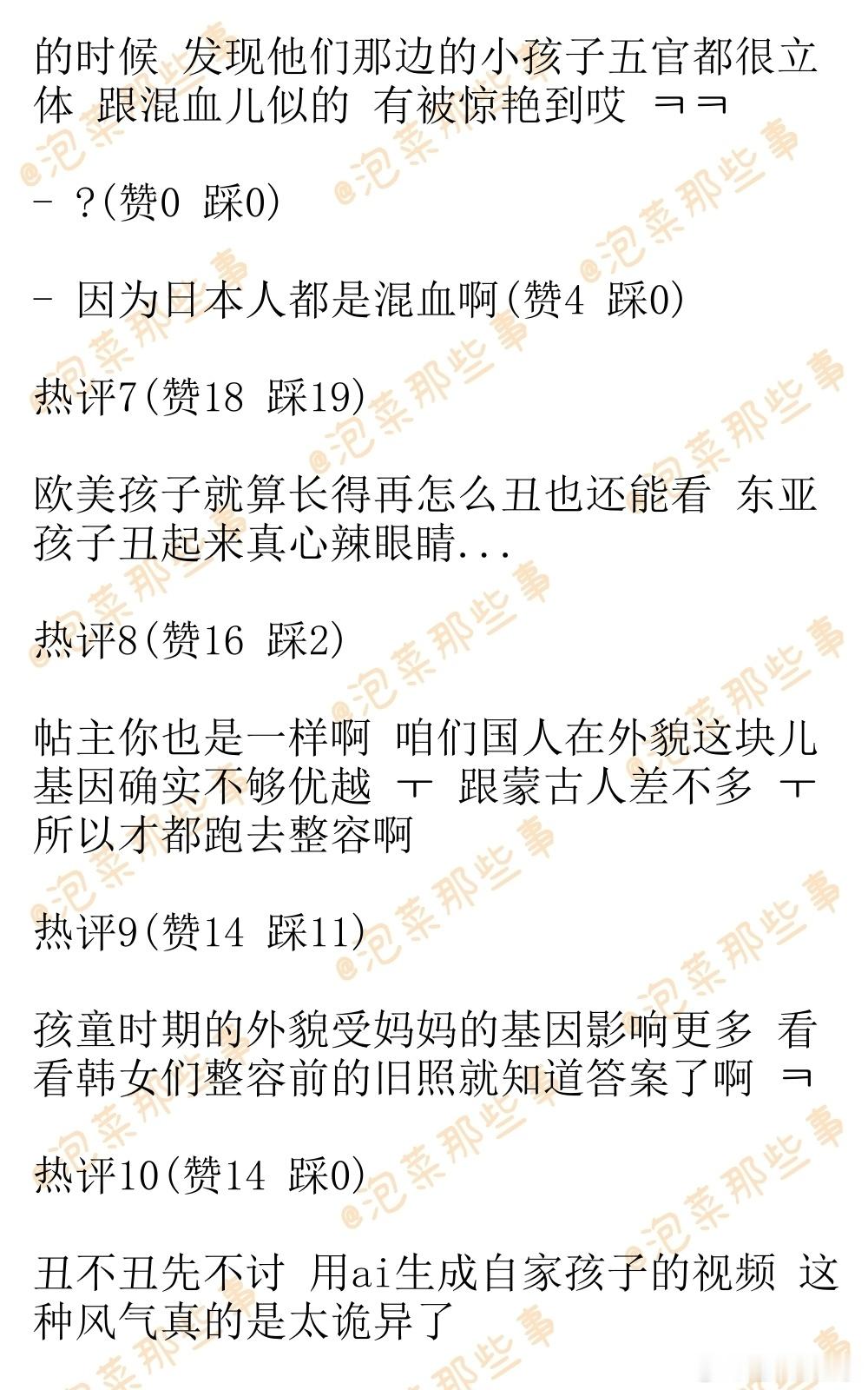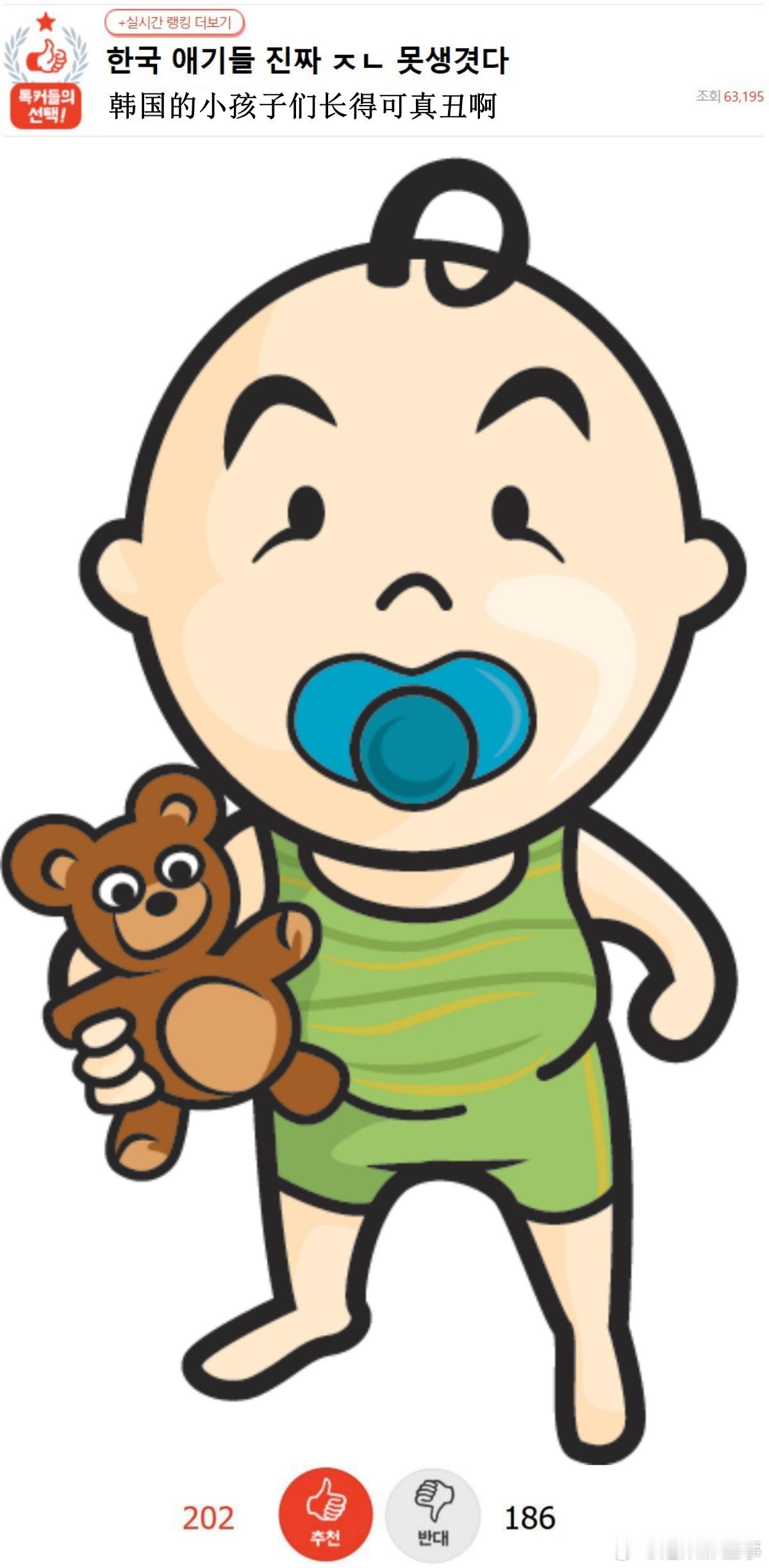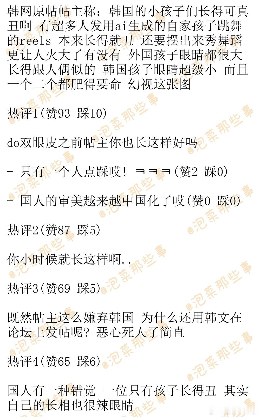 🔥韩网热帖评论翻译🔥韩国的小孩子们长得可真丑啊韩网原帖帖主称:韩国的小孩子们长得可真丑啊 有超多人发用ai生产的自家孩子跳舞的reels 本来长得就丑 还要摆出来秀舞蹈 更让人火大了有没有 外国孩子眼睛都很大 长得跟人偶似的 韩国孩子眼睛超级小 而且一个二个都肥得要命 幻视这张图cr.pann