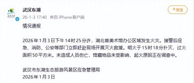 2026年1月3日下午14时25分许,湖北省美术馆办公区域发生火灾。接警后应急、消防、公安等部门立即赶赴现场开展灭火救援。明火于15时18分扑灭,过火面积50平方米。未造成人员伤亡,馆藏物品未受影响,起火原因正在调查中。