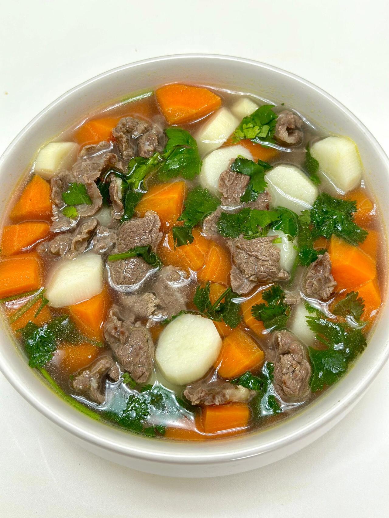 萝卜炖牛肉是一道经典 的家常暖身菜。牛肉 切块焯水后,与姜、葱、 八角等香料一同慢炖 至软烂。 待肉香四溢时,加入滚刀块的 萝卜继续焖煮。 萝卜充分吸收饱满的肉汁, 变得晶莹半透明, 口感清甜软糯, 完美化解油腻。 牛肉则酥烂入味, 汤汁醇厚浓郁。 这道菜荤素搭配, 营养互补,在秋冬时节 尤其受欢迎。一碗下肚, 从胃里暖到心里, 是简单却充满慰藉的味道。三斤牛肉炖萝卜 萝卜炖牛排汤 牛腱萝卜汤