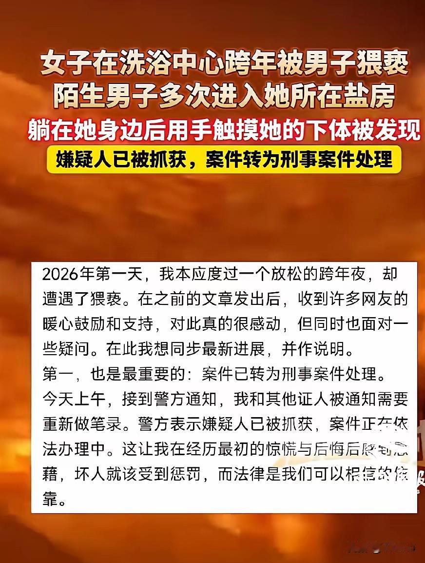 浙江杭州,一名女子揣着对跨年夜的期待,花一千多块买了家知名洗浴中心的套餐票。她想着前阵子工作太紧绷,正好借着节假日,在热气腾腾的汗蒸房里彻底放松一把。 可到了地方她才傻眼,这哪是放松地啊,简直是“人挤人”的菜市场!节假日的客流直接爆棚,光进场就排了两三个小时,腿都站得打哆嗦。一千多块的票都花了,总不能打道回府吧?女子咬咬牙,忍着疲惫跟着人群挪。 做项目要排队,拿盘水果也要排队,连找个歇脚的地儿都难如登天。可现场到处都是欢声笑语,气氛热热闹闹的,她只好安慰自己“既来之则安之”,耐着性子把所有项目做完。 折腾到后半夜,女子累得眼皮都快粘在一起了。总算在汗蒸盐房里找到个空位,当时周围空荡荡的,就她一个人。她心想洗浴中心人这么多,肯定安全得很,再加上汗蒸房暖烘烘的,困意瞬间涌上来,头一歪就睡得不省人事。 不知睡了多久,她迷迷糊糊间觉得不对劲,猛地惊醒!朦胧中瞥见身旁竟躺着个头发稀疏、身材肥胖的男人。可实在是太累太困了,她脑子都转不动,翻了个身又沉沉睡去。 这一觉,睡得更不安稳。恍惚间,一只手正不安分地往她下体摸去!女子瞬间惊出一身冷汗,噌地一下坐起来,正好撞见那只手慌忙缩回去。她心脏狂跳,厉声质问:“你在干什么?谁让你躺这儿的?” 那男人支支吾吾,先是死活不认,后来又狡辩说是“不小心碰到的”。女子气得发抖,逼着他道歉,对方才磨磨蹭蹭挤出一句“对不起”。可盐房里的大灯早就关了,光线昏暗得很,女子看着眼前的男人,总觉得他情绪不对劲。她怕把人逼急了,对方会做出更出格的事,只能强装镇定,呵斥着让他赶紧滚蛋。 男人悻悻地走了,女子却胃里翻江倒海,差点吐出来。好好的跨年夜,怎么就变成了这样?她又气又怕,跌跌撞撞地找到洗浴中心经理,要求调取监控。 可监控画面看得她当场崩溃!那个男人竟然来来回回进出汗蒸房好几次,而她因为睡得太沉,一次都没察觉!经理也坦言,暂时没法确定男人的身份。 女子越想越后怕,浑身的汗毛都竖了起来。她怎么也想不到,自己满心欢喜来放松,竟会在洗浴中心遭遇这种恶心事!她不敢深想,在自己熟睡的那段时间里,那个男人到底还做了些什么。 事后,女子把自己的经历发到网上,字字泣血地提醒所有女生:遇到这种事,千万别因为害怕就放走坏人!一定要第一时间报警,法律才是最靠谱的依靠啊!
