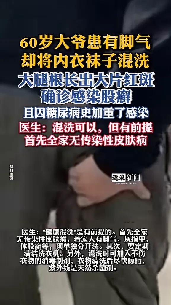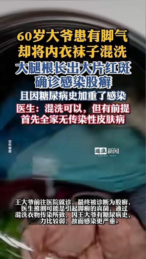 “悲剧还是发生了!”河南郑州,一大爷患有脚气,却喜欢将内衣袜子一起混洗,结果大腿根长出大片红斑,用药后症状加重,去医院检查才知道感染了股廯,还因为患有糖尿病,导致更病情严重了。医生:混洗的前提是全家无传染性皮肤病! 这位大爷患脚气已经十多年了,平时洗衣服为了图省事,总是把袜子和内裤一块儿扔进洗衣机。他想着反正都是自个儿的衣物,混在一起洗还能省水省电。没想到,就是这个习惯惹出了大麻烦。 开始他只是觉得大腿根有点痒,后来那片皮肤越来越红,长出一片吓人的红斑,痒得坐立不安。自己抹了点药膏,症状不但没减轻,反而更严重了。拖到没办法才去医院,医生诊断是股癣,大概率是脚气上的真菌通过混洗的衣物感染了皮肤。 大爷本身有糖尿病,身体抵抗力比一般人弱,真菌逮着机会就疯狂发展,使得感染特别厉害。像大爷这样因为混洗内裤袜子导致交叉感染的情况,在皮肤科门诊并不少见,有人甚至把真菌传染到了身体其他部位。 很多人觉得袜子臭,肯定比内裤脏。其实不然,内裤上沾染的分泌物、尿渍甚至微量的粪便,携带的细菌种类一点儿也不比袜子少。这两样东西的“脏”是各有特点,袜子,尤其是有脚气的人穿的袜子,是真菌的“大本营”;而内裤则是多种细菌的“聚集地”。 家里要是有脚气、灰指甲这类传染性皮肤病的患者,内衣袜子坚决要分开洗,洗衣机也要定期清洁,不然它会变成一个巨大的细菌真菌传播源。 要是实在想混洗,得做好消毒和干燥,洗涤时可以加入适合的消毒液,洗完后最好在太阳下暴晒,利用紫外线天然杀菌,或者用烘干机高温烘干,避免潮湿环境让微生物繁殖。 对于家中有老年人、儿童、糖尿病患者等免疫力相对较弱成员的家庭,洗衣卫生真的不能马虎。一个小小的懒惰和疏忽,可能就要用漫长的难受和治疗来弥补。 各位读者你们怎么看?欢迎在评论区讨论。