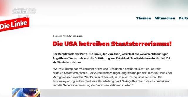 此外,德国左翼党主席扬·范阿肯3日发表声明称,美国强掳委内瑞拉总统马杜罗的行动是违反国际法的国家恐怖主义行为。德国政府应立即通过联合国安理会和联合国大会启动谴责美国军事行动的程序。