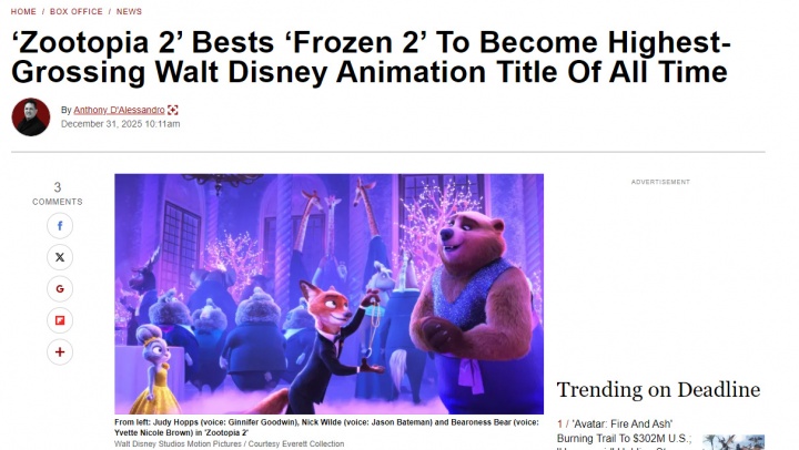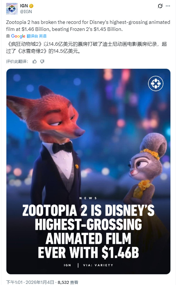 直播吧01月04日讯据外媒报道,截止2025年12月31日,迪士尼动画电影《疯狂动物城2》全球累计票房已突破14.6亿美元,超越《冰雪奇缘2》的14.5亿美元票房,正式成为迪士尼工作室有史以来票房最高的动画电影。