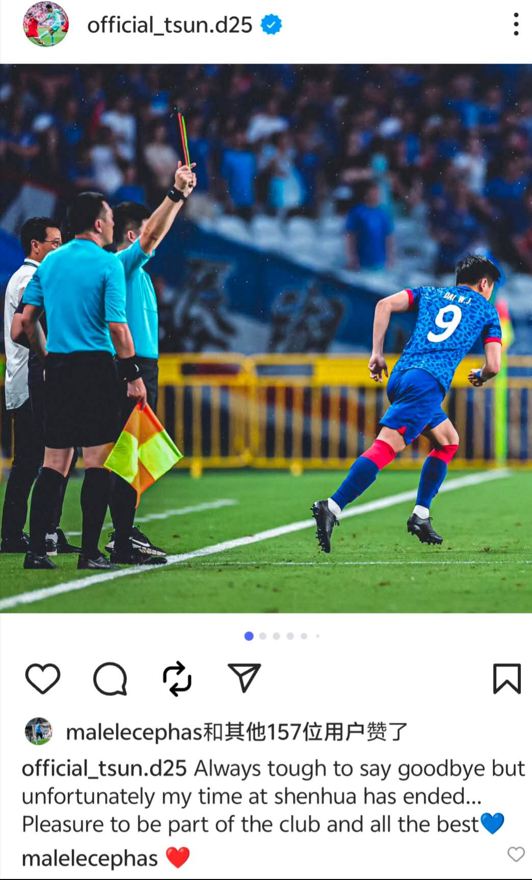 戴伟浚在个人INS上写道:“说再见总是艰难,但遗憾地是,我的申花生涯已经结束……我很荣幸自己曾是申花俱乐部的一员,祝好运!”