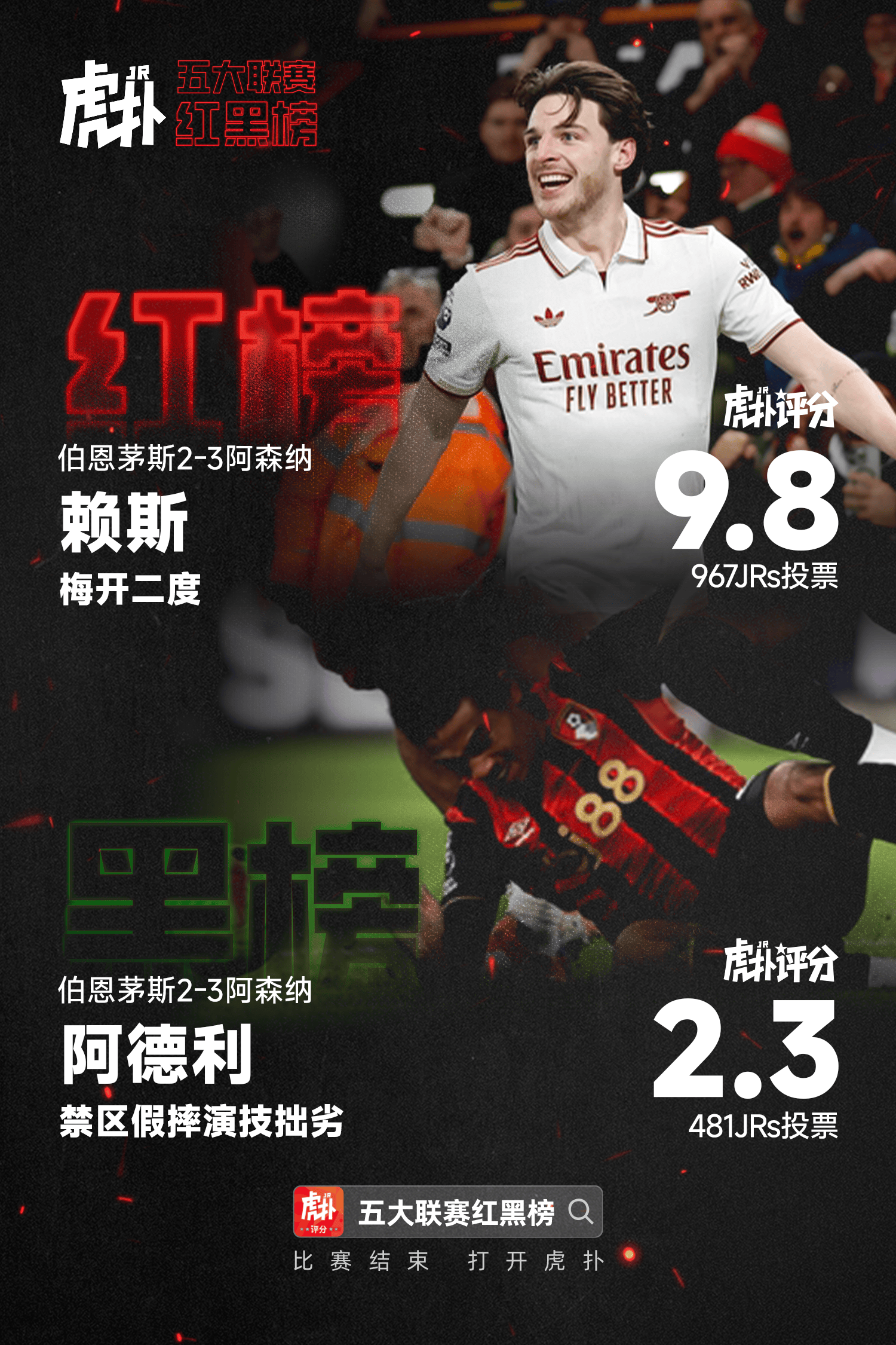 红榜方面,阿森纳球员赖斯梅开二度,帮助球队客场战胜伯恩茅斯,助阿森纳稳定领跑积分榜。