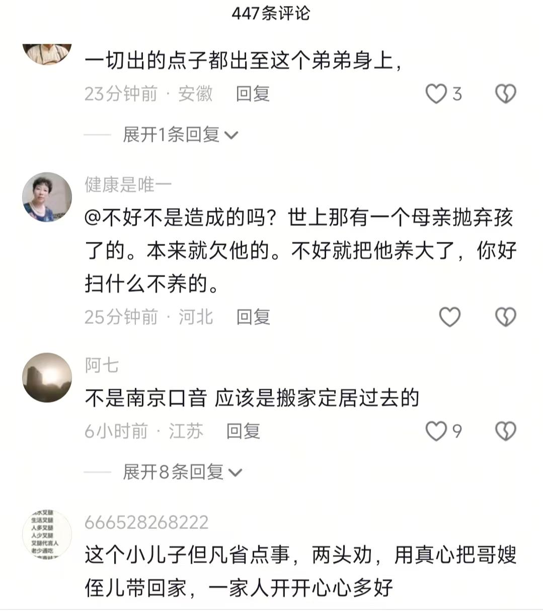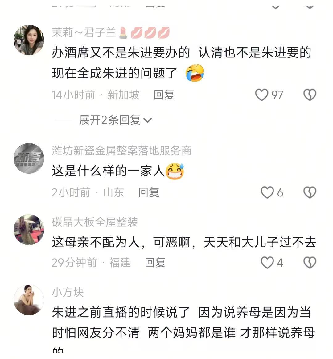 看到南京那对双胞胎生母开直播了,我忍了 看到她直播怼儿子朱进,就因为朱进不肯改名,她和她儿子给人网爆了,我也忍了 可是看到生母直接对着镜头骂朱进,话说得挺难听,我实在忍不住了 你敢相信吗!南京那对双胞胎的家事彻底炸锅了!生母居然趁老公和小儿子都不在,单独开直播怼儿子朱进,就因为朱进不肯改名。本来想安安静静刷会儿短视频摸鱼,结果刷到这场直播回放,全程高能到我眼睛都不敢眨,你们敢信亲情能闹到这份上?更绝的是,后面反转一个接一个,看得我又郁闷又困惑,这事儿真不是一般的离谱。 直播里,生母直接对着镜头骂朱进,话说得挺难听。她一口咬定,就因为朱进不改名字,她和孩子爸、小儿子天天被网友骂,日子过得闹挺。说实话,我本来还觉得她可能有啥难处,但后来看到网友扒出的微信聊天截图,瞬间就改观了——朱进在微信里还恭恭敬敬叫她妈妈,听说亲爸生病还主动说要去探望,礼数做得足足的,可她还是一个劲催改名,这就有点说不过去了。 之前我刷到过个评论,有个阿姨说她邻居家也有类似的事:抱养的孩子成年后,亲生父母找过来要改名字,结果养父母直接拿出从小到大的开销单,当场就把人怼回去了。现在想想,朱进这事比那复杂多了,毕竟还牵扯到直播流量和带货收益,水太深了。 生母在直播里还掰扯了五点,听得我直皱眉。先说弃养不是故意的,还说“你们身边没这种经历吗”,不是吧?弃养还能找这种借口?又说送朱进的黄金是家里唯一的,吐槽七零后过得不容易。结果转头朱进妻子就晒了黄金和红包明细,证明亲生父母总共才给了3万多,根本不是生母说的10多万,这反转来得太给力了! 她还说小儿子没动过粗、人善良,就朱进有心机,说朱进是有了流量想独吞带货收益,才跟家里闹掰,流量差的时候就故意吵架造话题。说实话,这话我是真不信,哪有亲生母亲这么说自己儿子的?更膈应人的是,她还质疑朱进养家妈妈付出少,说朱进结婚都没买房,言外之意就是养家没尽到责,甚至说朱进的两个姐姐是见他赚钱了才亲近,这话说得也太伤人了。 之前听我姥姥说,人家常讲“种什么因得什么果”,当初把孩子送走,现在又因为名字和利益闹得不可开交,这不就是实打实的因果嘛。我之前还见过个类似的事:我表姐的同学是抱养的,亲生父母后来找过来想认亲,还想让他帮衬弟弟,结果人家直接拿出养父母带他看病、供他上学的所有单据,当场就说“你们生了我没养我,这些年的付出都是养父母给的,要帮衬也轮不到你们”,当场就把亲生父母怼得说不出话。 朱进最后还是把抖音名改了,但这事根本没平息。网友们分成两派吵得不可开交,一派觉得生母只认利益不认亲情,一派觉得朱进可能也有自己的考量。说实话,看到这我都绷不住了,亲情在流量和利益面前,咋就变得这么脆弱呢? 总之,一家人哪有隔夜仇,真有矛盾好好沟通才是正解。闹到全网皆知,最后只会两败俱伤,多不值当啊!你们觉得这事里谁更占理?