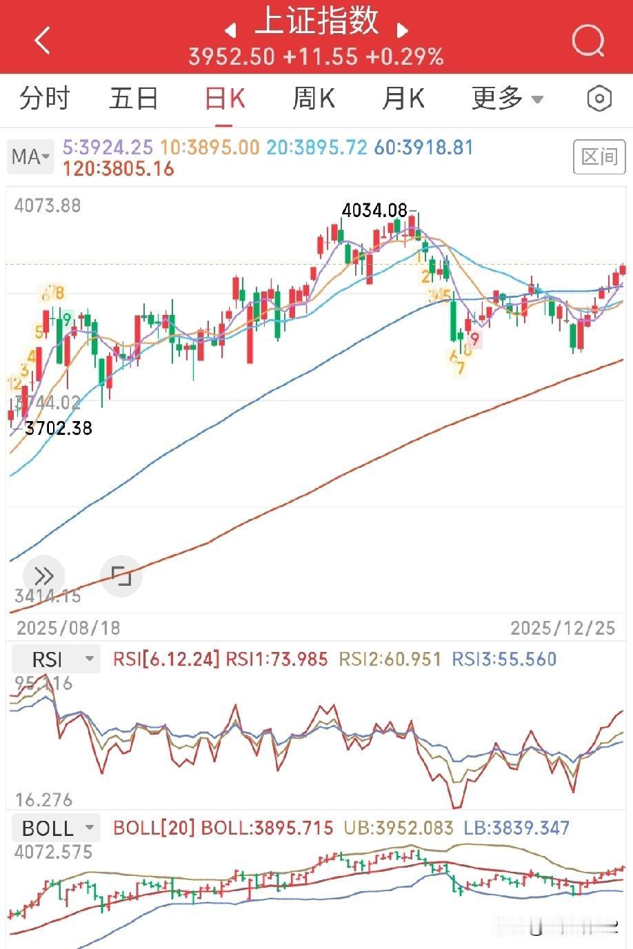12月25日午评。两市上午涨跌不一,成交量能持平(图1)。诸大指数都呈一种阶段高位调整的走势。从上午盘面看起来,沪强深弱,但是我们要请楚地看到,沪指已经来到日K布林线上轨的3852点处(图2),显示此处有压力。那么,下午指数会如何演绎呢? 直接亮明观点,算上今天,沪指已经7连阳,指数也来到3950点的压力位,且成交量能始终未能有效放大,反正我是不相信市场能够直接上攻4000点的。预计下午,沪指会有冲高回落。 不管接下来指数是去回踩一脚考验20天均线的支撑力度后继续上攻,还是这里就是一个反弹平台后期尚需向下寻底,或者说指数就是在3816点~3950点作区间震荡也好,反正指数短期回调的可能性极大。须谨慎看待市场。操作上一定要控制好仓位,还是老观点,3~5成仓为宜。 板块上,热点轮动非常快,关键的是板块内部还出现分化,前期高位板块和高标股纷纷调整,在这种情况下,盲目追高的风险相对来说是较大的,一动勿如一静,看看市场是否会有短期调整、调整情况如何,然后再作进退考量可能更符合当下行情的操作策略。 个人观点,不构成投资依据,不喜勿喷。祝大家下午好运。