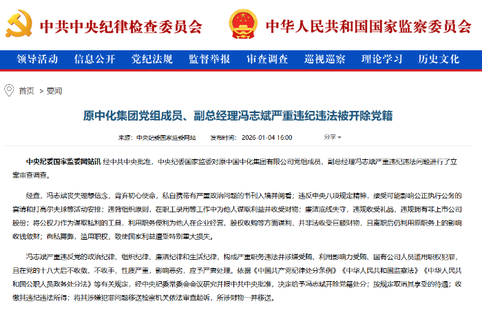 经中共中央批准,中央纪委国家监委对原中国中化集团有限公司党组成员、副总经理冯志斌严重违纪违法问题进行了立案审查调查。