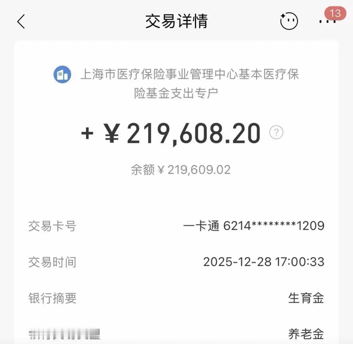 天呢!看到21.96万生育津贴,是不是产后抑郁都没了 上海有宝妈晒银行截图,生育津贴直接到账21.96万,这数字比好多人一年工资还高,评论区直接炸锅! 可能有人没概念,这笔钱有多顶?普通打工人辛辛苦苦上班,一年能攒下20万的都少见,这生个娃就直接到手,简直是“生娃暴富”现场。 其实这钱不是白给的,有明确算法:上海产假158天,反推下来这位宝妈单位月均缴费基数得有4.18万,工资高补贴才高。 而且这不是个例!之前就有上海网友晒过21.67万的津贴,还有人说难产+多胎能领到近30万,看来高补贴在上海真不稀奇。 为啥大家这么羡慕?养娃的成本谁扛谁知道!0-3岁光奶粉尿不湿一年就得2万,再加上早教、体检,花钱跟流水似的。 这笔补贴简直是及时雨,既能给娃买好点的用品,宝妈产后也能安心休养,不用刚生完就琢磨赚钱,焦虑都少了大半。 但也别光眼红,这钱和单位工资挂钩。能领20多万的,本身家庭收入就不低,算上工资公积金,一年破百万很常见。 反观咱们普通人,单位月均工资刚过万的话,按公式算下来也就几万块,跟上海的“天花板”比,差距不是一般大。 更有意思的是各地补贴差得离谱!浙江灵活就业宝妈能领两万多,江苏灵活就业却只有生产报销,没有津贴。 呼和浩特生三孩每年补1万,能领10年;合肥宝妈产检花一堆,最后只领800块“安慰奖”,这差距比过山车还刺激。 网友们的评论笑不活了:“给我20万,我能生到政策允许上限”“建议全国统一标准,别让生娃福利看城市”。 也有人理性说:“大城市缴费基数高,补贴自然多,但能实实在在发钱,就是好政策”。 其实不管补贴多少,大家羡慕的是政策给的底气。现在养娃压力大,能少掏点钱、多份保障,谁不乐意? 希望未来更多城市能跟上,不管是大城市还是小地方,都能让生娃的家庭少点负担、多点安心。 你所在的城市生娃能领多少补贴?觉得这样的补贴能让你愿意多生一个吗?来评论区聊聊~