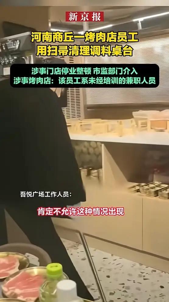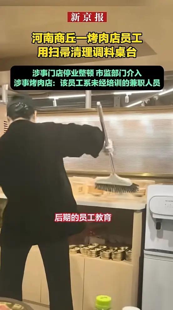 “顾客天塌了!”1月3日,河南商丘,一女子在烤肉店用餐时,发现一名服务员竟用扫把清理调料台,清理完后还接着扫地,扫下的污渍直接落到下方的餐具柜,这让女子瞬间没了食欲,开始担心自己用的餐盘是否干净。网友:谁还吃得下去! 调料台上摆着各种小料,旁边就是洗净待用的碗盘,那位头戴黑帽的服务员,手里那把扫帚先在台面上来回刮擦,把残渣扫进簸箕,紧接着非常自然地弯腰,用同一把扫帚开始清理地面,扫帚头上的碎屑直接掉进了下方餐具柜的盘子里。拍摄视频的网友当时还在就餐,这一幕让她十分不适,胃口全无。 1月4日,涉事烤肉店做出回应,解释称这名员工是新来的,而且是一名未经系统培训的兼职人员。店方表示,事发后已向顾客道歉,并已辞退这名员工,广场管理方也已责令该门店停业整顿。 商丘市睢阳区市场监督管理局的工作人员确认已关注到此事,并派人前往现场调查处置。宋城市监所的工作人员直言不讳地指出,这种行为确实影响食欲。门店在其官方账号评论区公开致歉,表示已对涉事员工进行开除并追究法律责任,管理层也已撤职,并承诺对店铺进行全面消杀。 表面看是一个新员工的违规操作,背后暴露的却是餐饮行业老生常谈的卫生管理漏洞。扫帚该用在哪儿,抹布该怎么分,这些最基本的操作规范,绝不是可以“无师自通”的常识。国家相关卫生规范明确要求,清扫工具应设独立存放点,不同区域、不同用途的抹布和工具必须明确区分,防止交叉污染。用扫帚扫完调料台再扫地,恰恰违背了最基本的卫生原则。 这次扫帚扫台面事件,拷问的不仅是涉事餐厅的培训是否到位,更是餐饮企业对于卫生标准的敬畏心到底有多重。对消费者而言,信任的建立需要长年累月,而崩塌往往只在一瞬间。 各位读者你们怎么看?欢迎在评论区讨论。