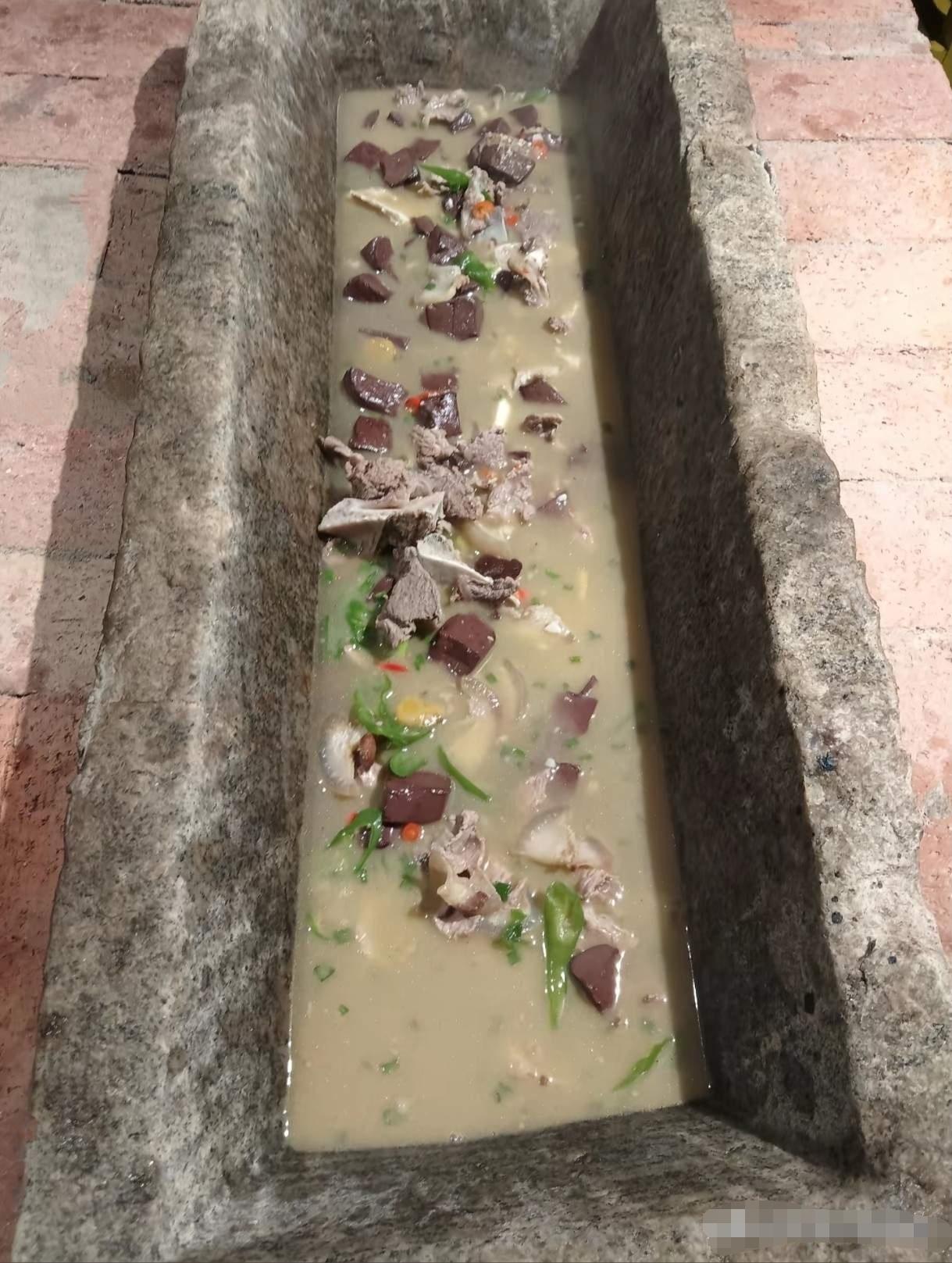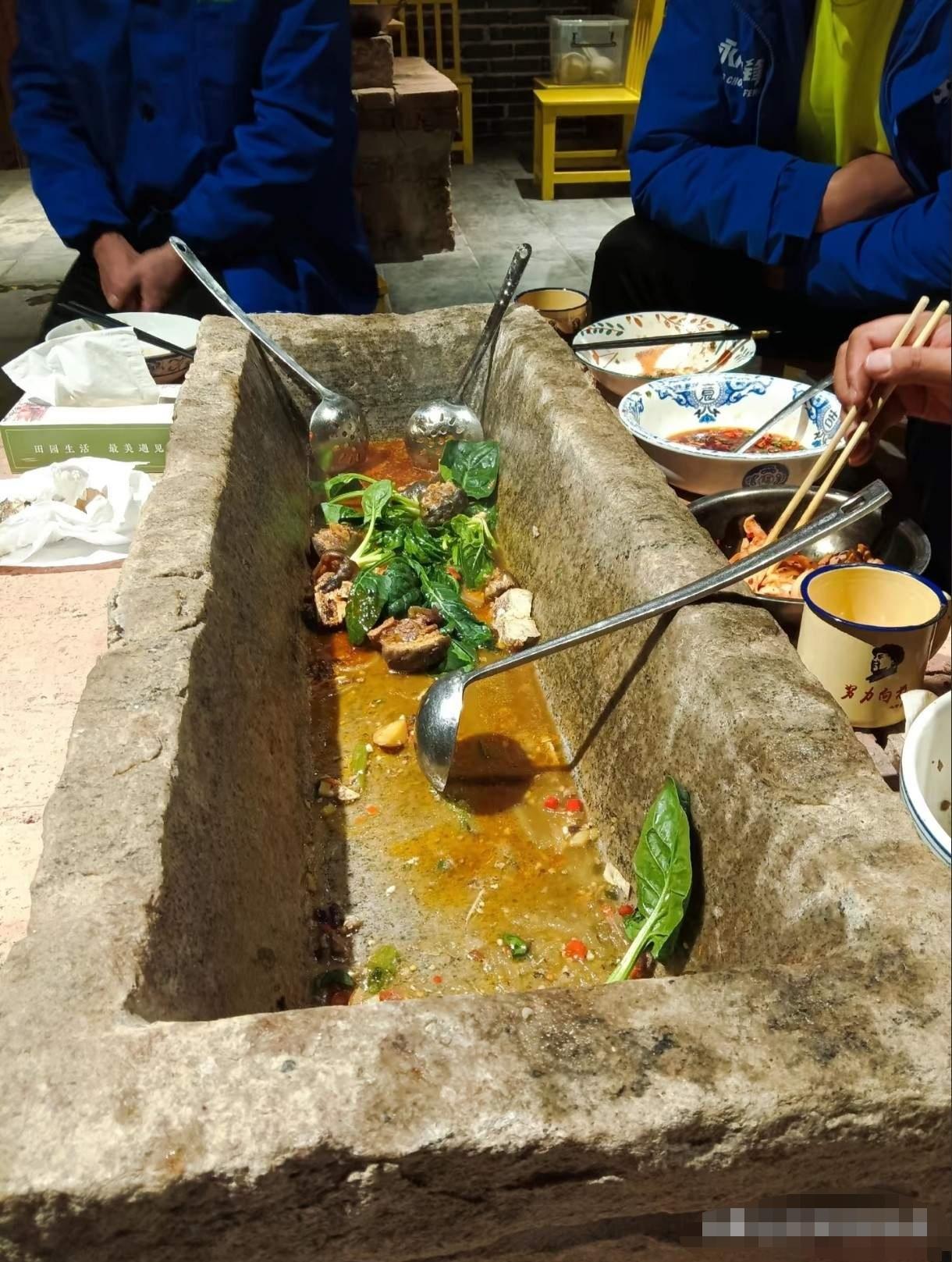这跟猪槽是不是同款?这个餐厅的饮食文化果然不一样哈,这应该是一款复古农耕风的餐具,让客人体验了一把“拱食”的快乐。卫不卫生,安不安全,用什么来消毒,如何消毒杀菌,暂且不说,就凭这餐具,就能让你体验了猪槽的文艺复兴。我就想知道餐厅的老板,以前是干啥的?