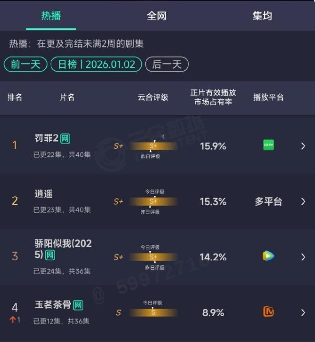黄景瑜《罚罪2》热度破9500 《罚罪2》云合占比15.9%,热度对应9500,《骄阳似我》云合14.2%,对应热度29000,所以爱奇艺的9500还是比腾讯的29000含金量要高,《逍遥》云合15.3%,双平台分流,优酷和爱奇艺热度都刚破8000.