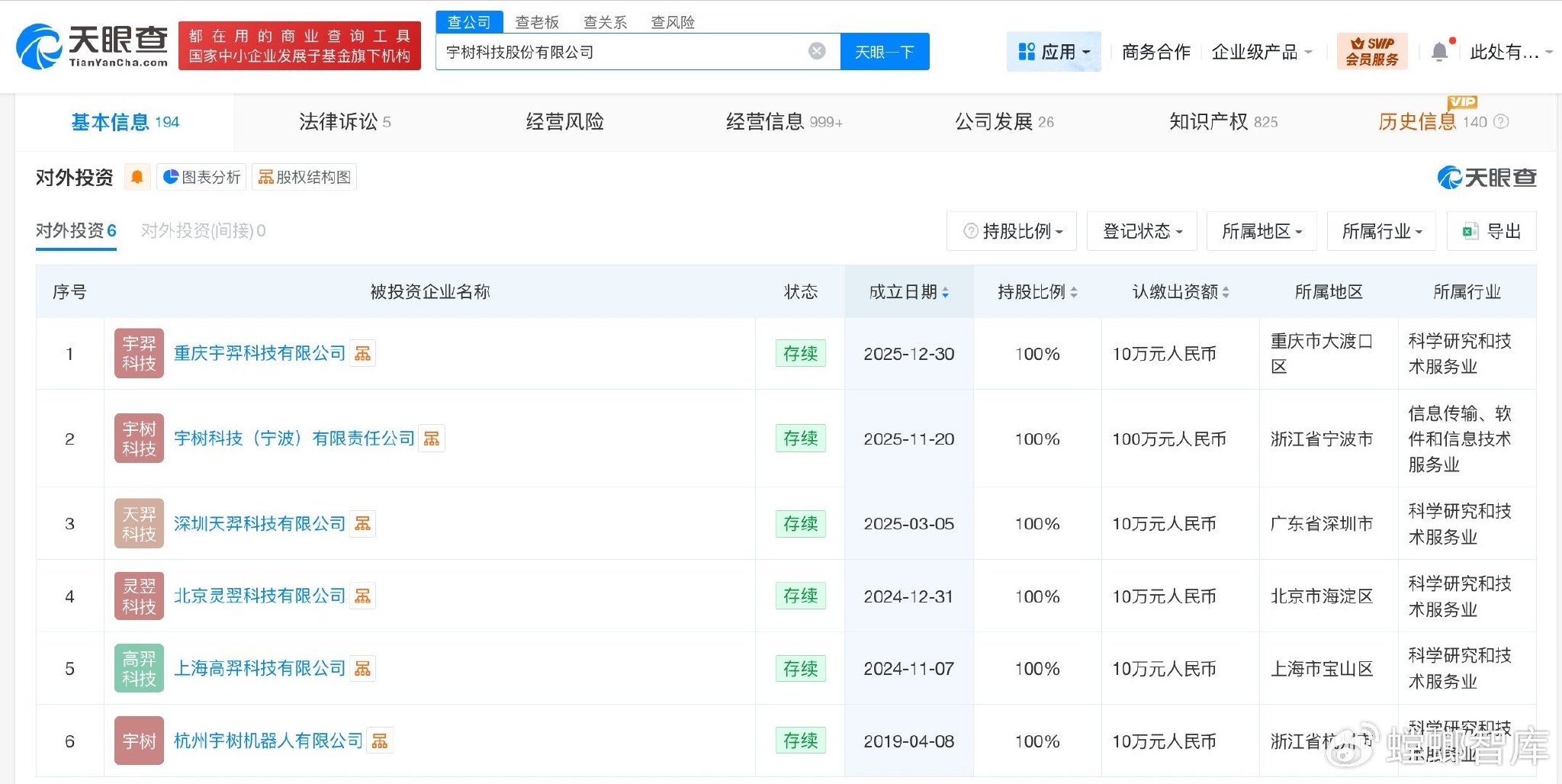 天眼查工商信息显示,宇树科技关联公司宇树科技股份有限公司成立于2016年8月,法定代表人为王兴兴,注册资本约3.64亿人民币,经营范围含软件销售、智能机器人的研发、智能机器人销售、工业机器人制造、工业机器人销售、机械设备研发等。股东信息显示,该公司由王兴兴、汉海信息技术(上海)有限公司、宁波红杉科盛股权投资合伙企业(有限合伙)、上海宇翼企业管理咨询合伙企业(有限合伙)等共同持股。对外投资信息显示,该公司在内地直接持股6家企业,均为存续状态。值得一提的是,2025年以来,宇树科技已成立多家新公司,包括重庆宇羿科技有限公司、宇树科技(宁波)有限责任公司、深圳天羿科技有限公司。此外,该公司已多次增资并多次更名。